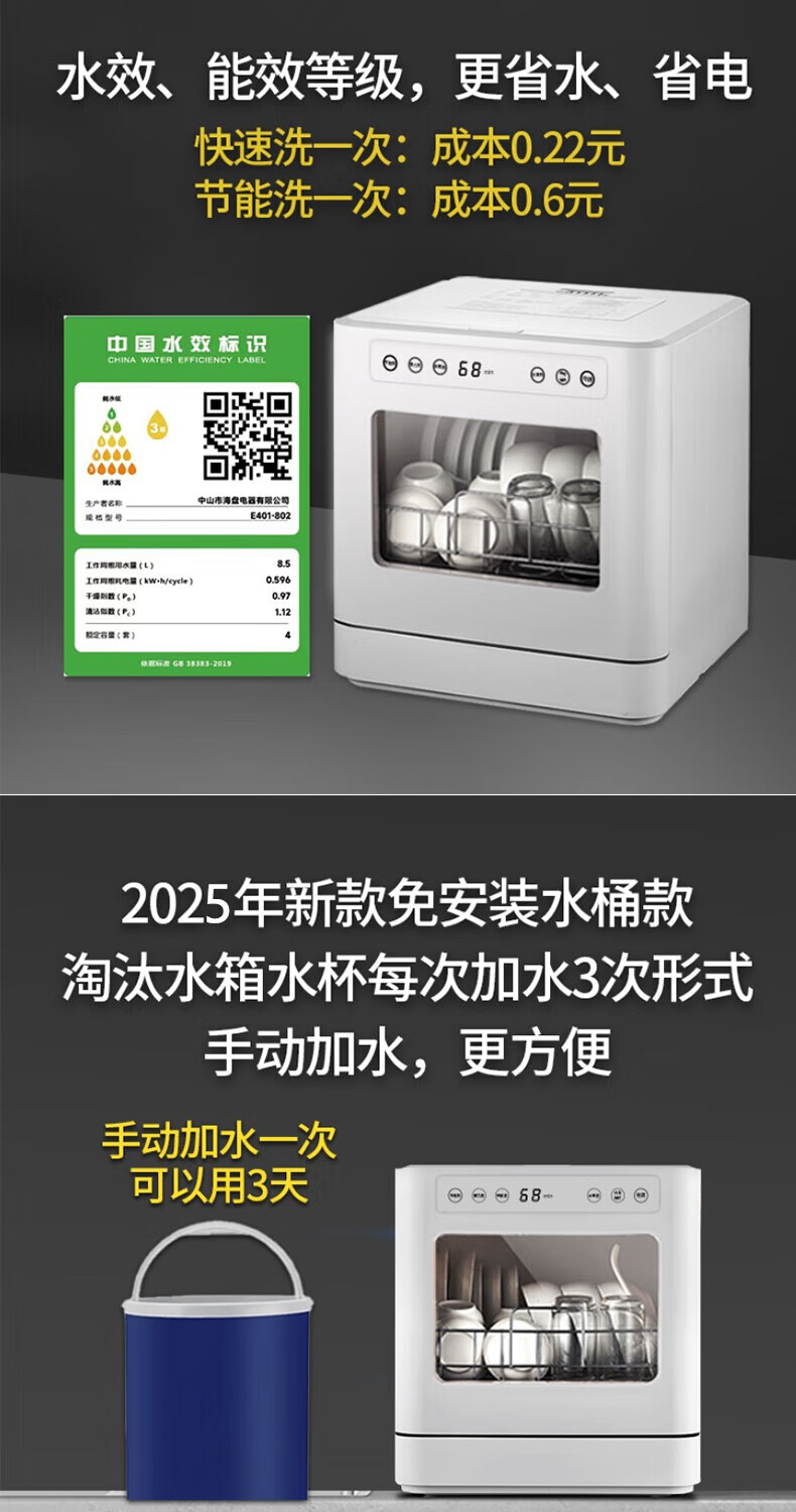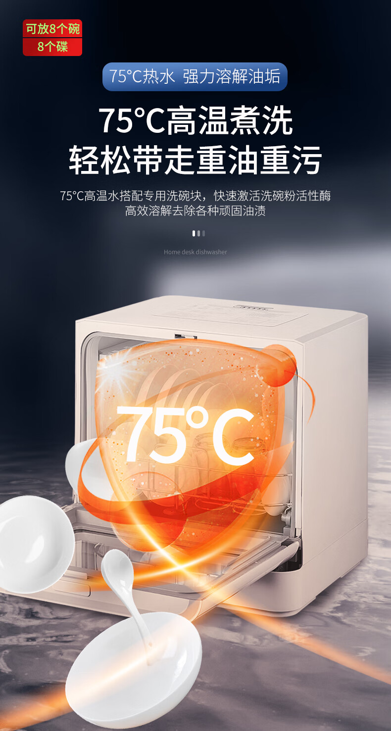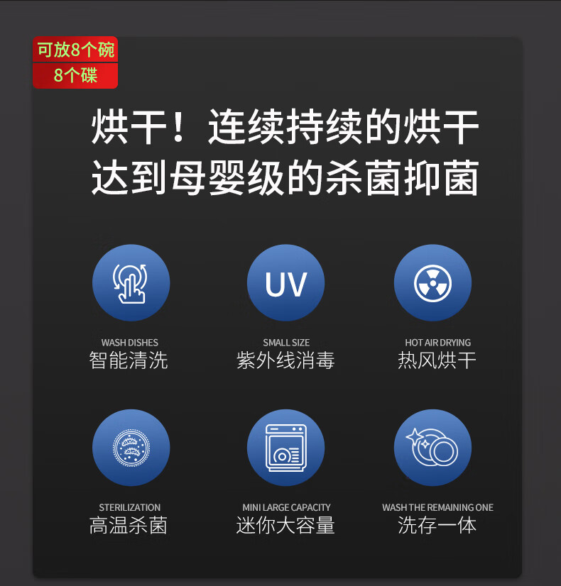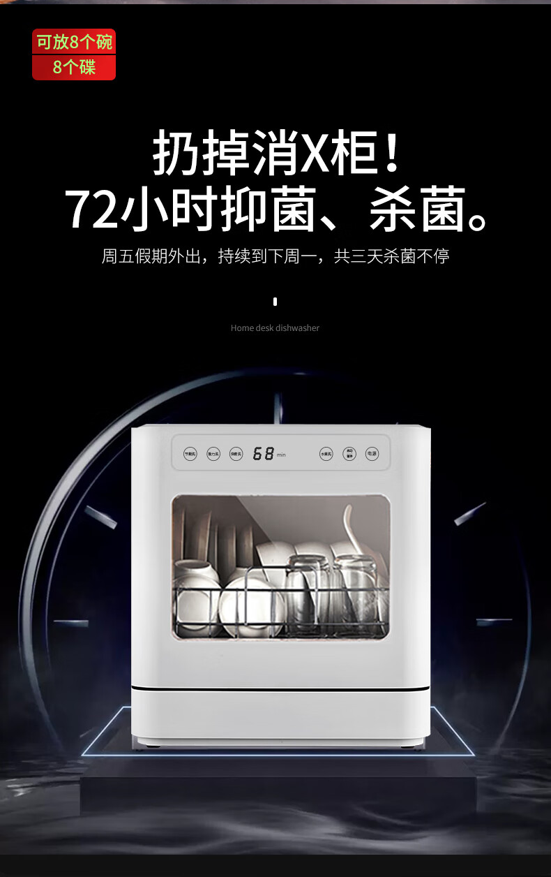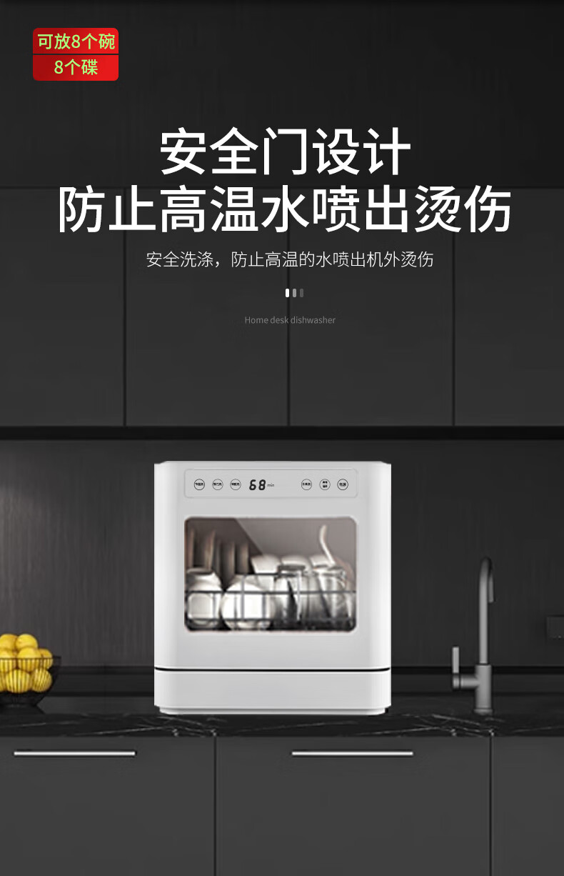 Little Sun 8-person dishwasher, large capacity, household desktop, smart, small, fully automatic drying, multi-function, installation-free, bench-mounted dual-purpose, dual-mode model - tap water/self-absorbing water, length, width and height 43*39*46 cm
