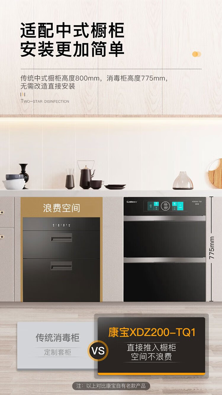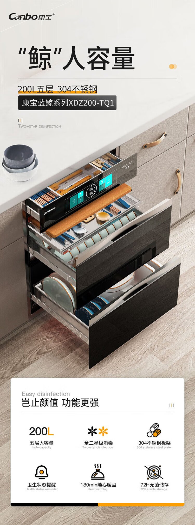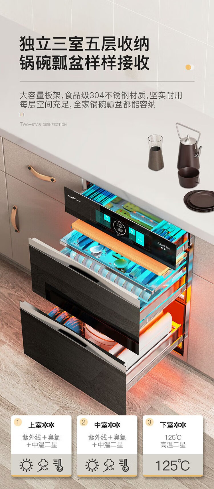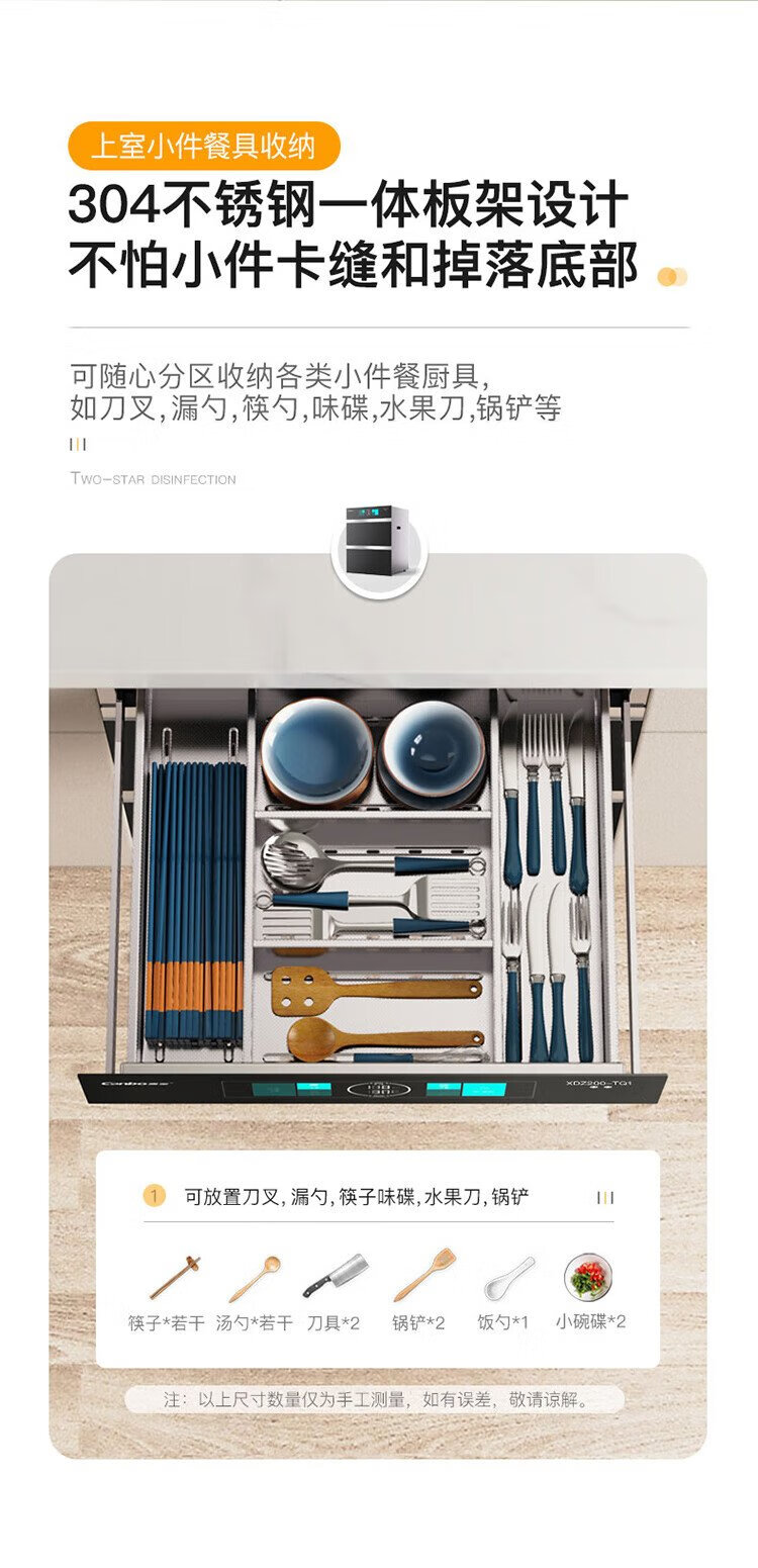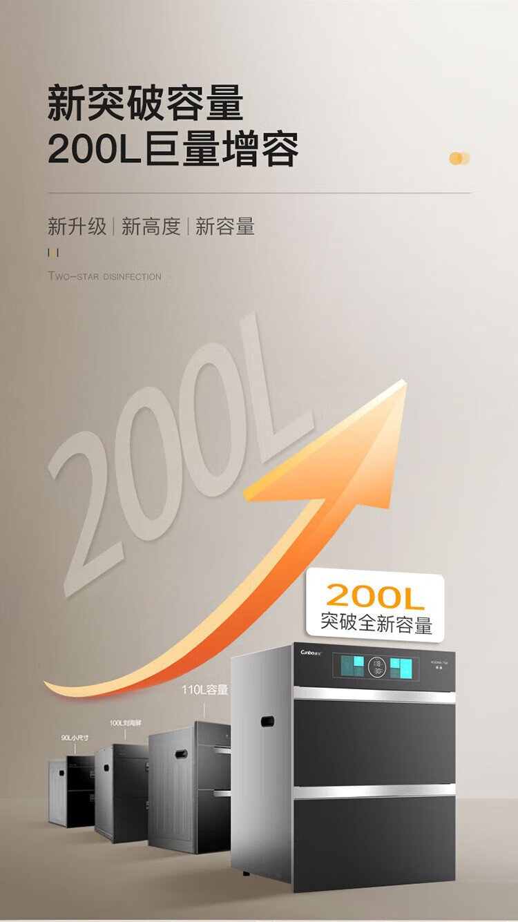 Canbo 304 stainless steel 200L five-layer disinfection cabinet embedded household ultraviolet tableware two-star massive disinfection cupboard national subsidy XDZ200-TQ1 Blue Whale