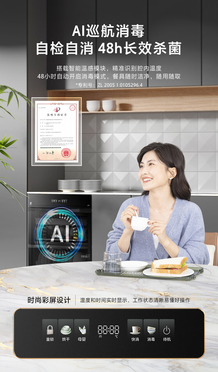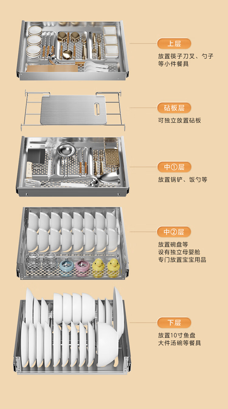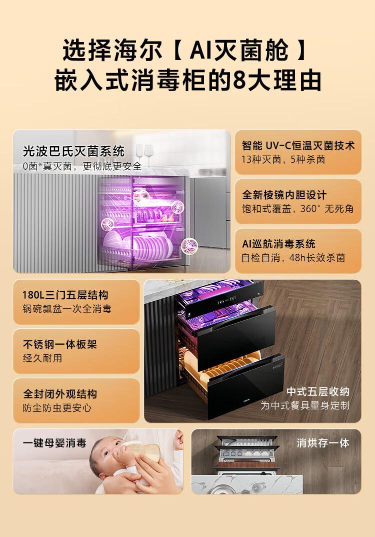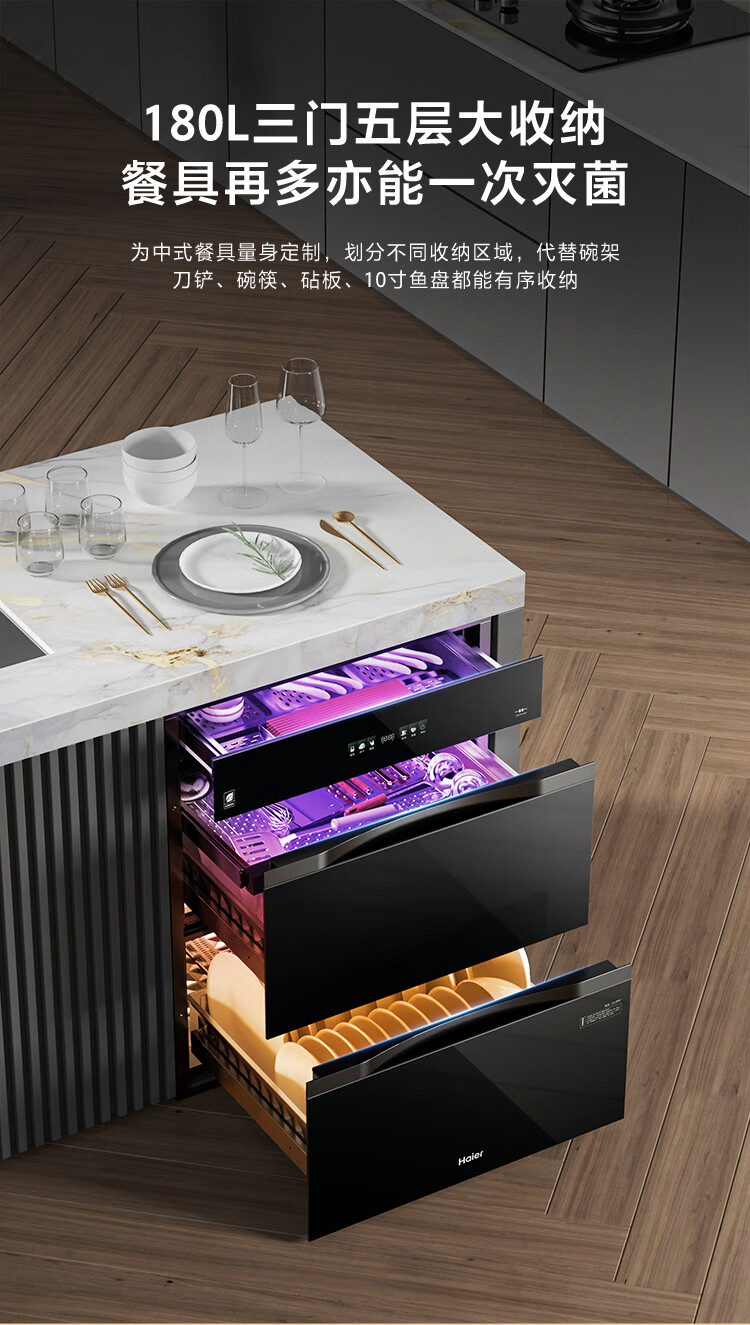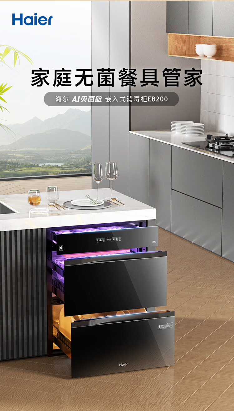 Haier 180L three-pump five-layer large-capacity disinfection built-in household mother and baby disinfection cabinet EB200 tableware disinfection ultraviolet + light wave pasteurization pure physical disinfection two-star 180 liters built-in
