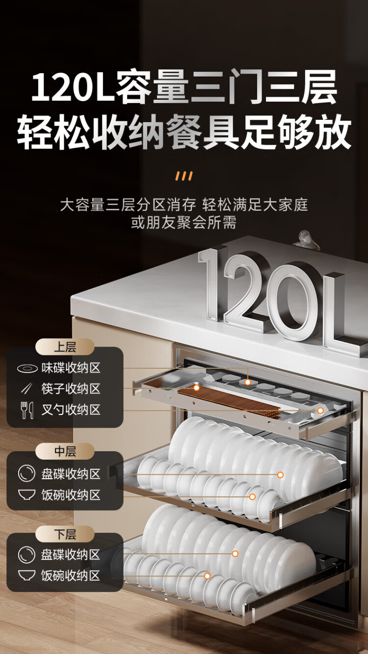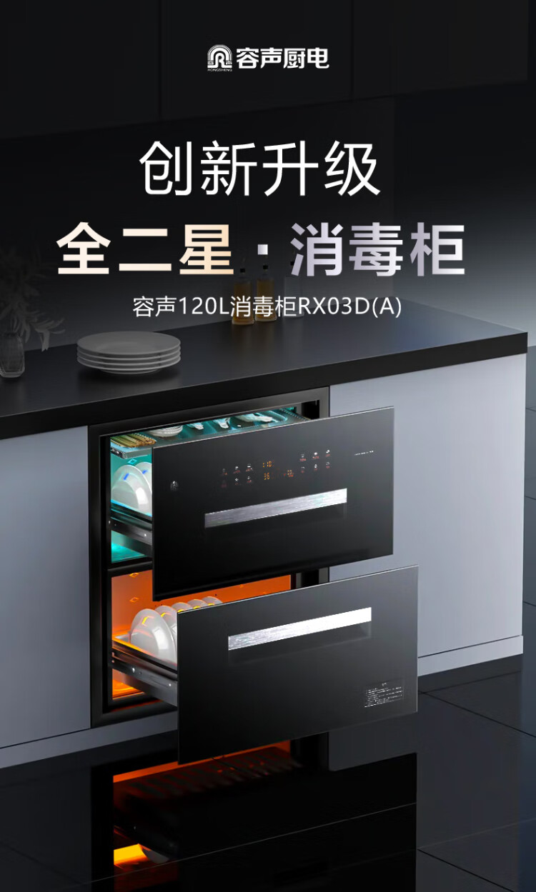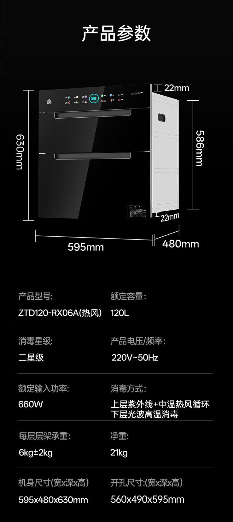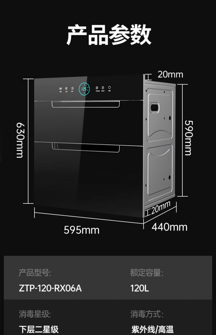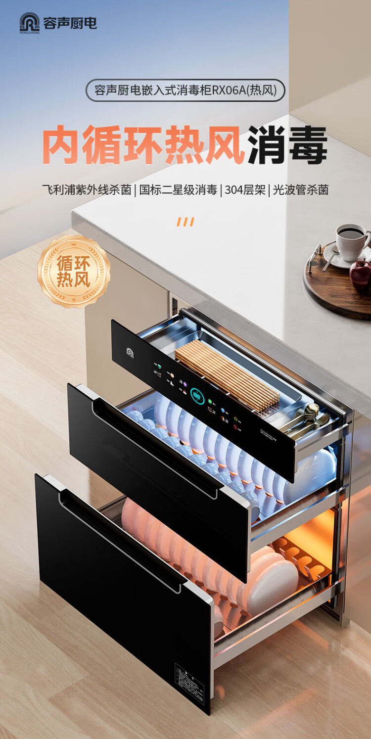Rongsheng disinfection cabinet embedded household disinfection cupboard large capacity two-star tableware tableware kitchen high temperature inlaid type two-star 120L hot air circulation 304-layer rack 06A hot air