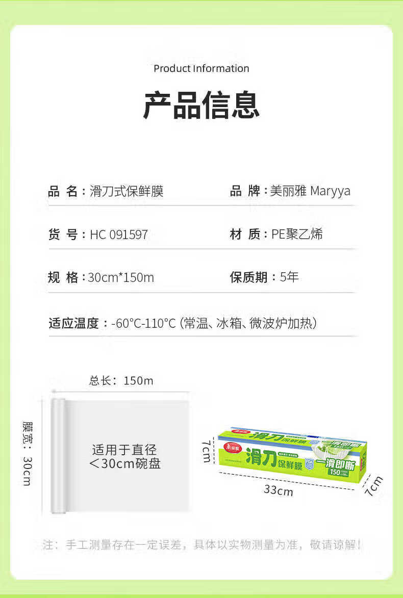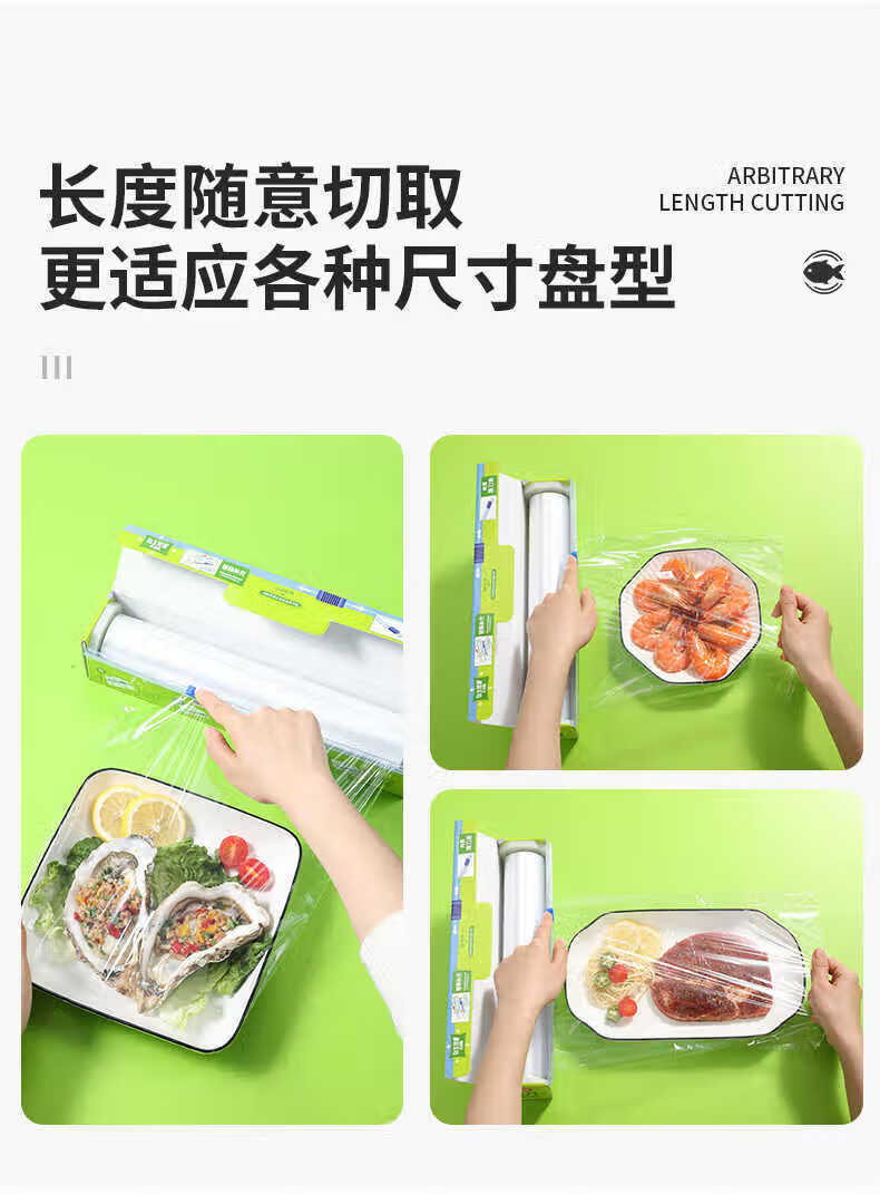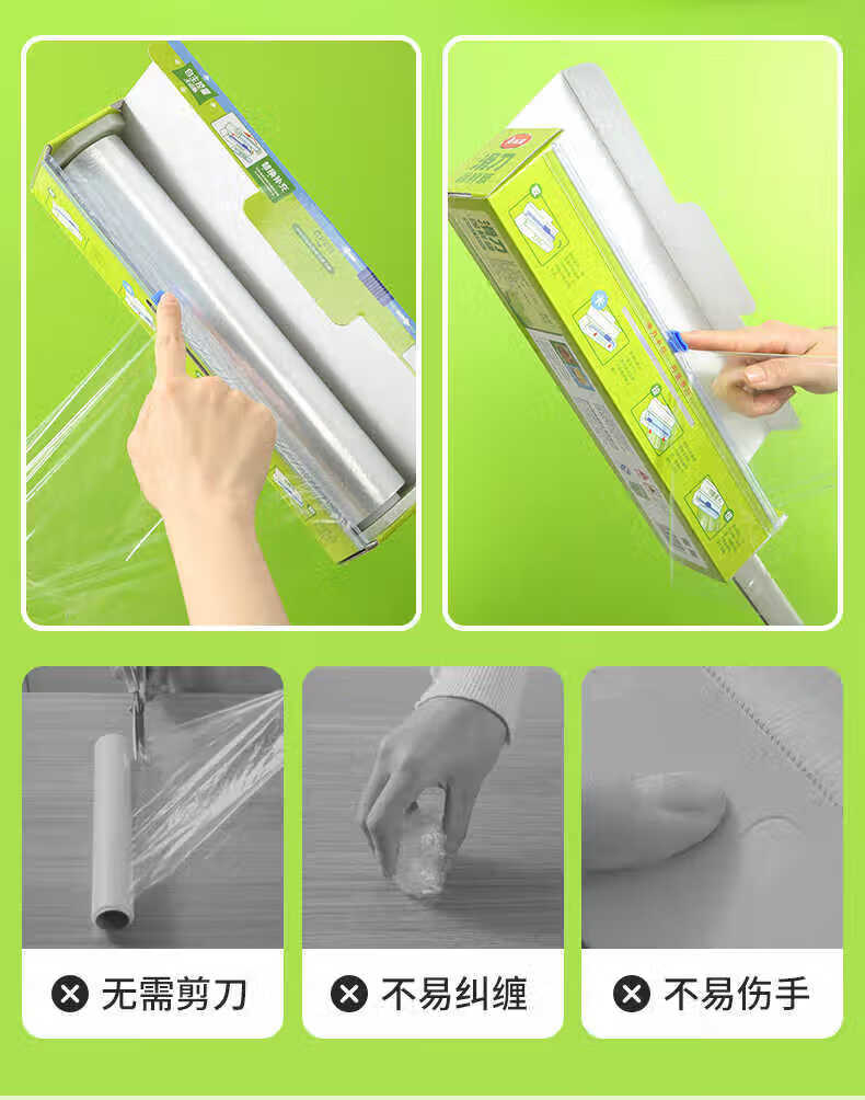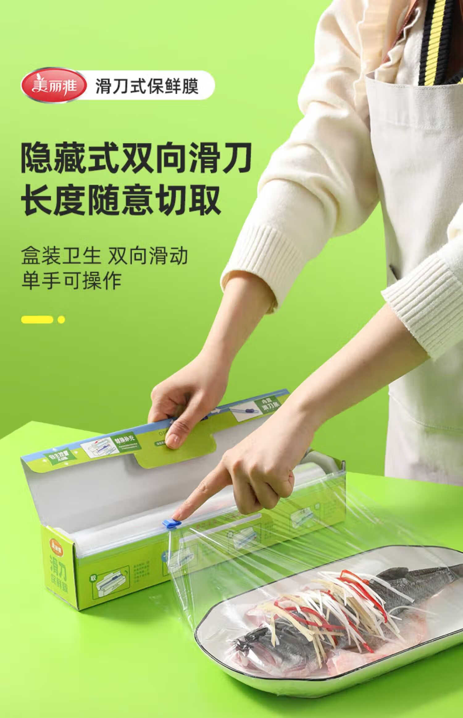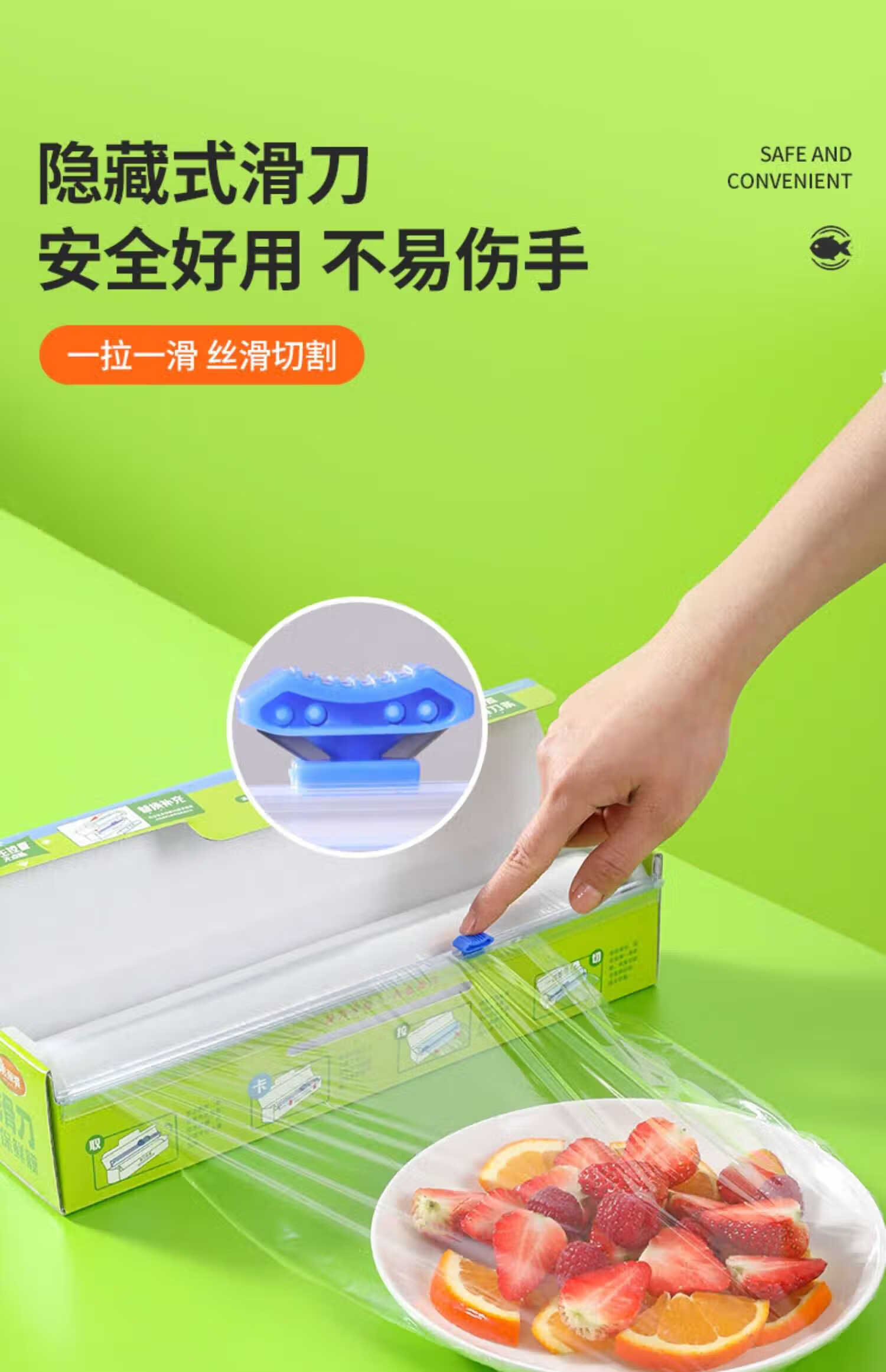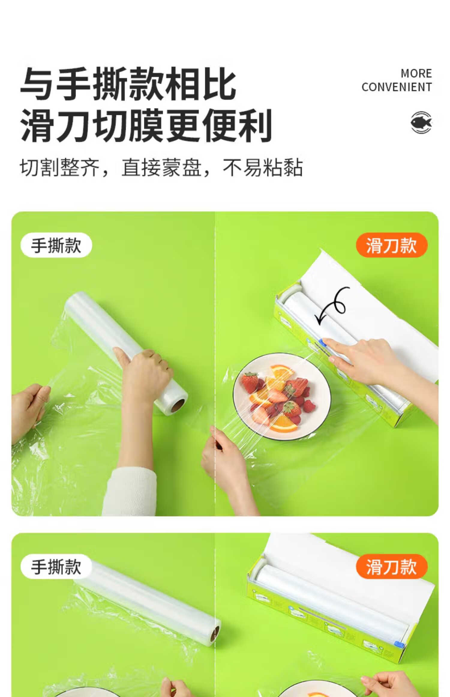 MARYYA sliding knife cling film with cutter high temperature and low temperature resistant food grade household commercial PE cling film box film integrated sliding knife cling film 150m*3