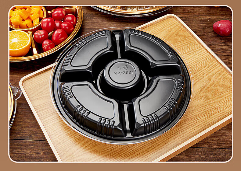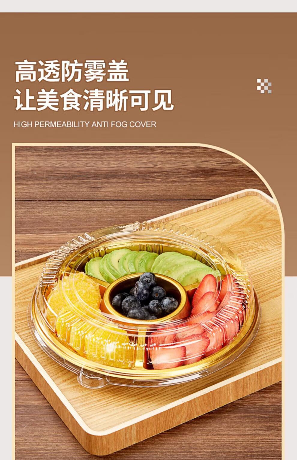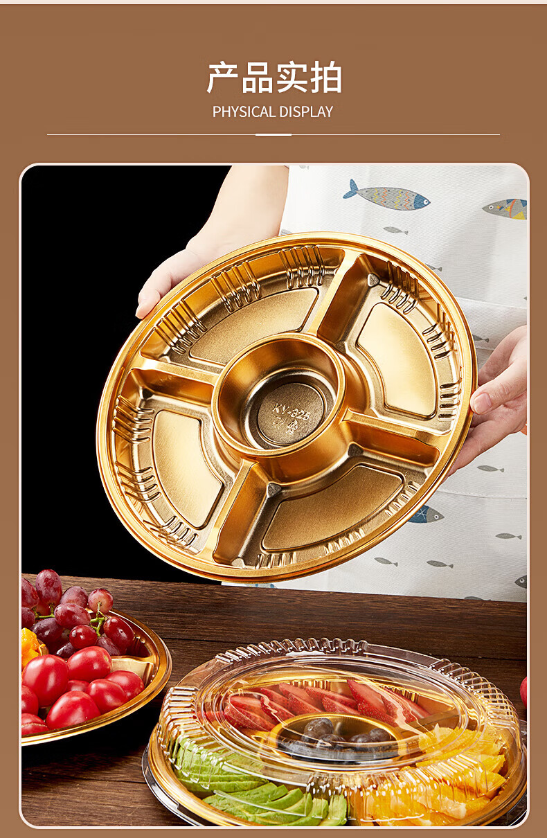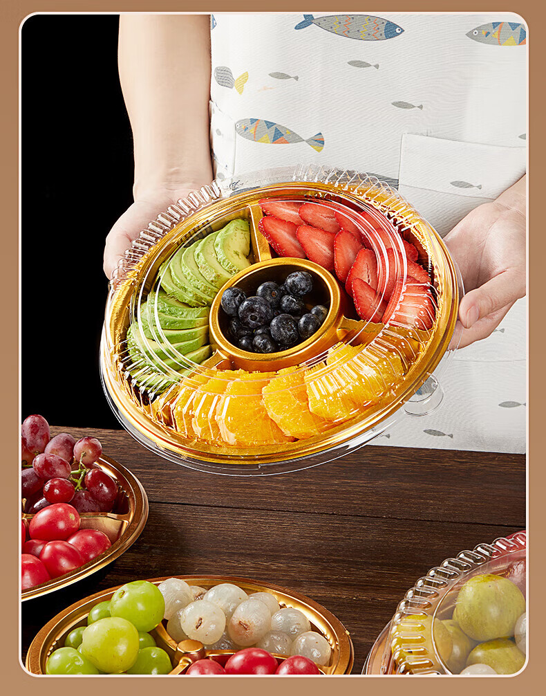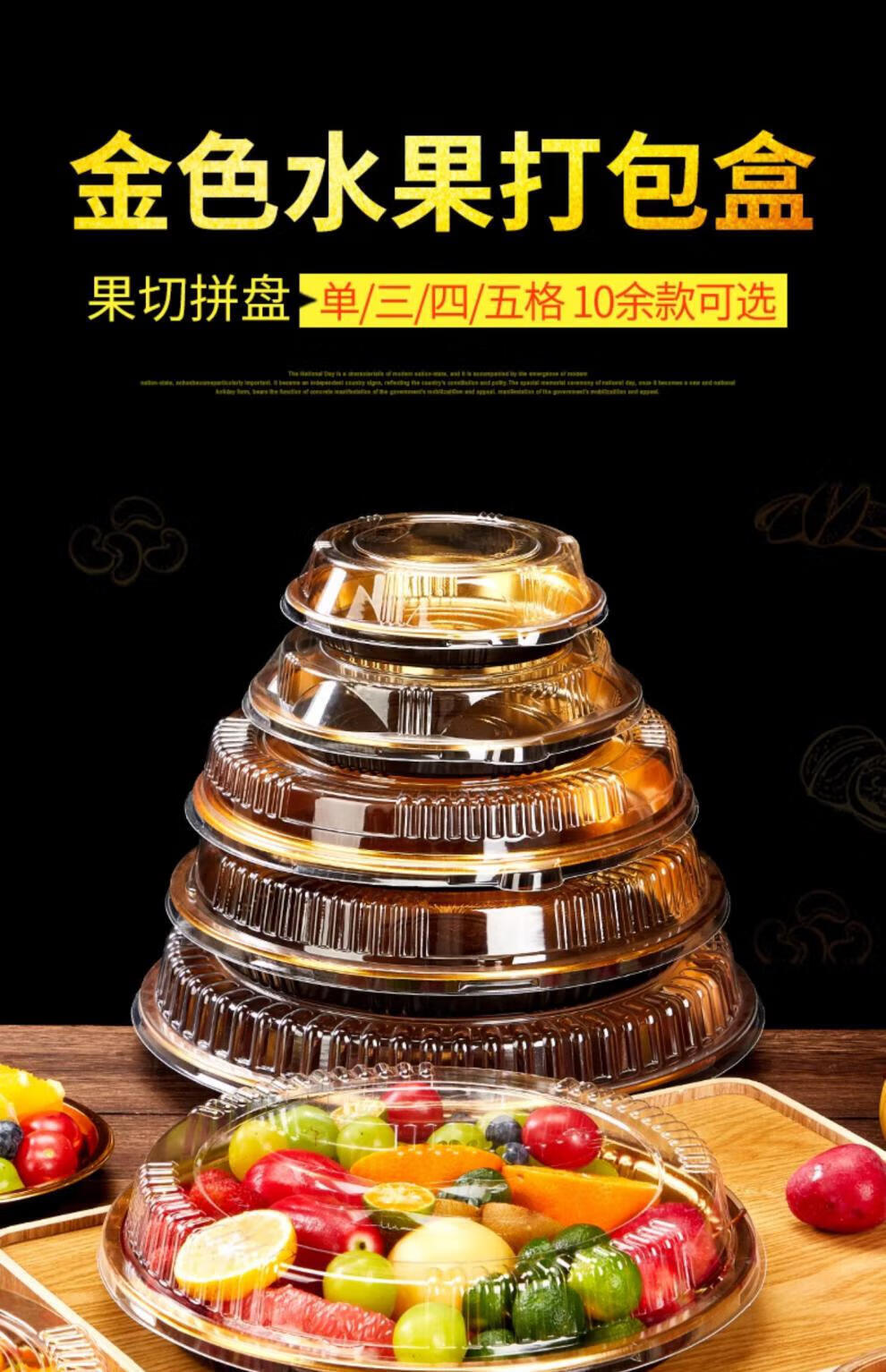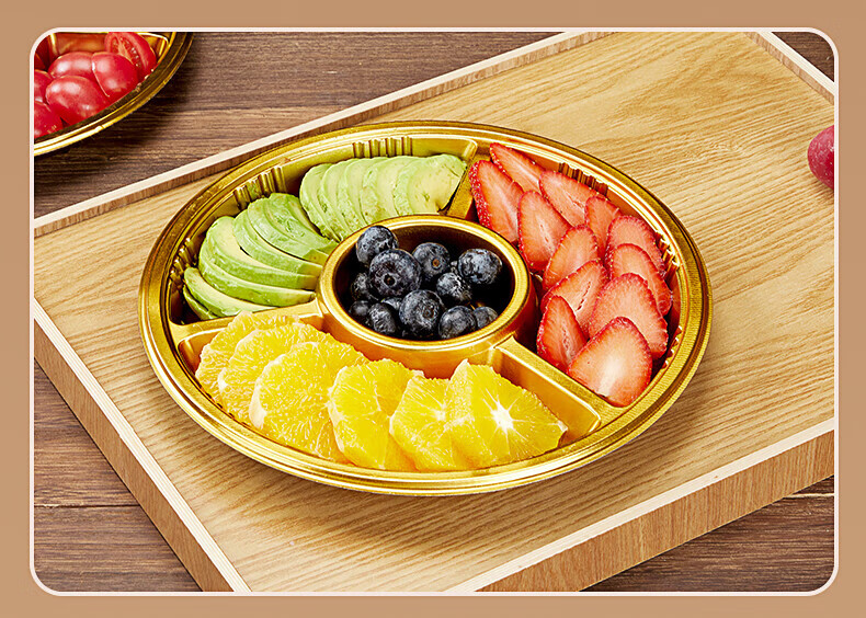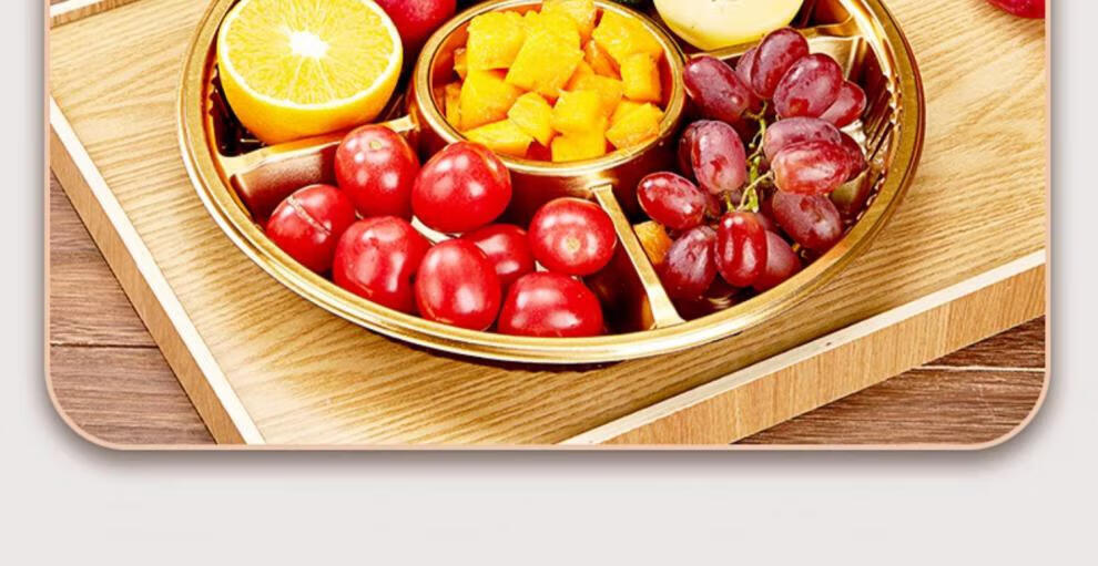Tanqi Disposable Fruit Plate Golden Fruit Cutting Packing Box Three or Four Fruit Cutting Boxes Double Set Lunch Box Autumn Outing Platter 25cm Round Plate Five-Gate Gold 50 Sets