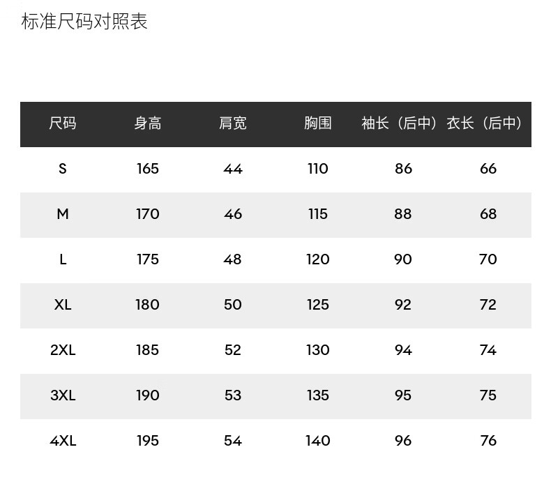 China (cm) 160-165/84-86 165-170 / 88-90 167-172 / 92-96 168-173 / 98-102 170-176 / 106-110