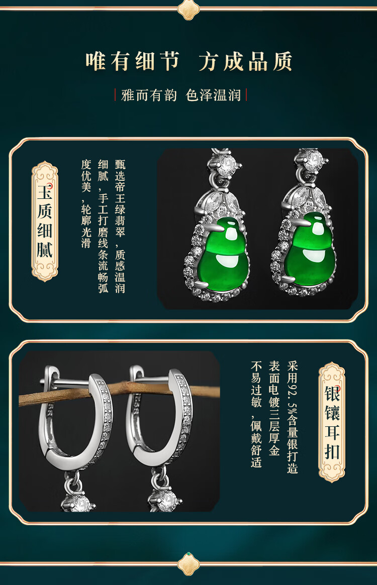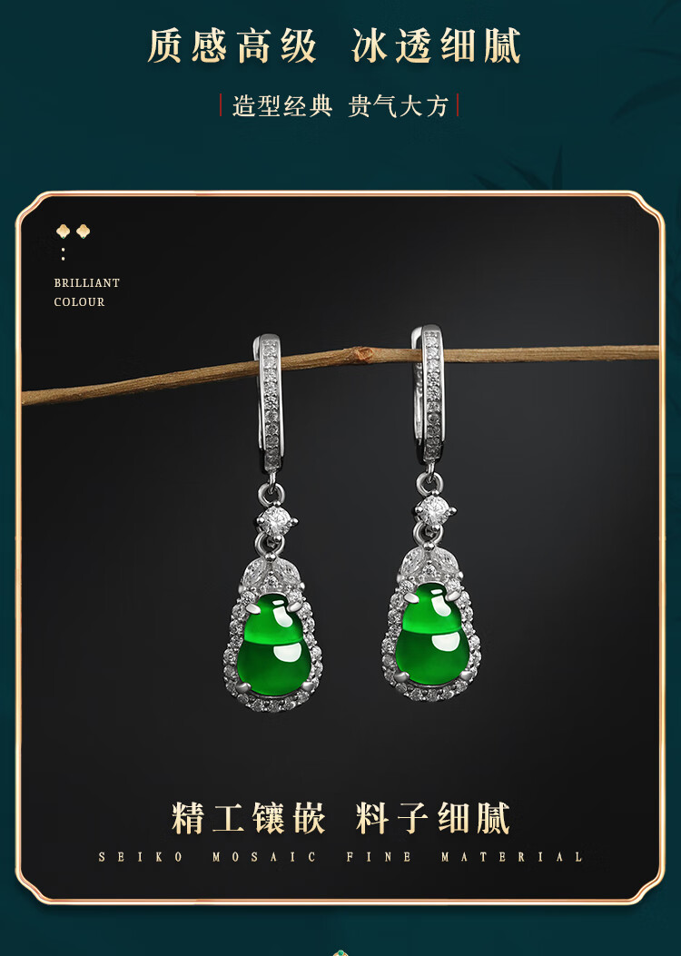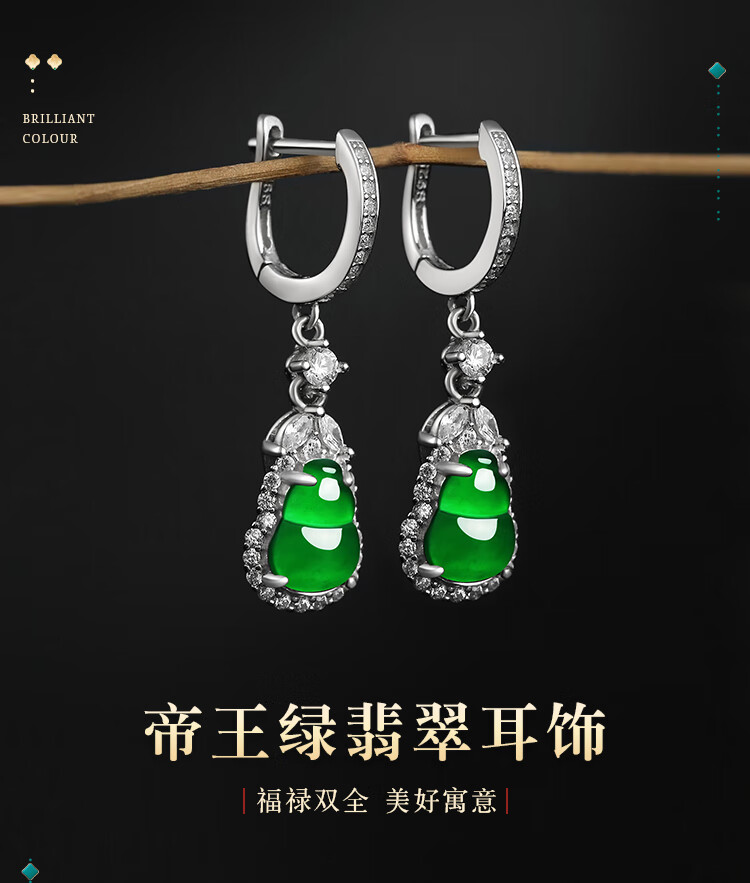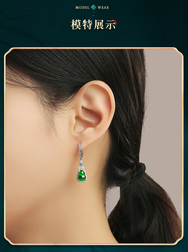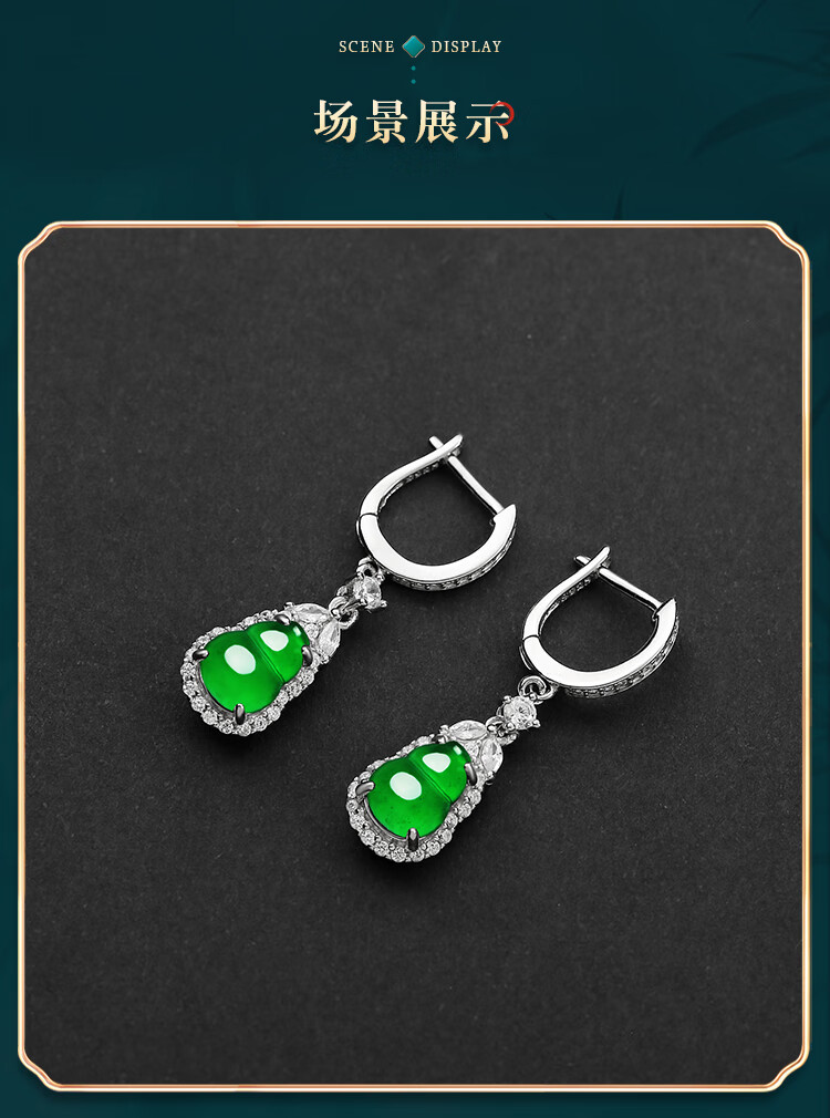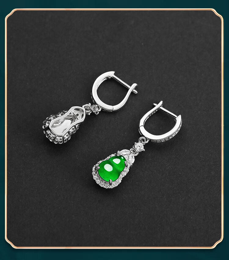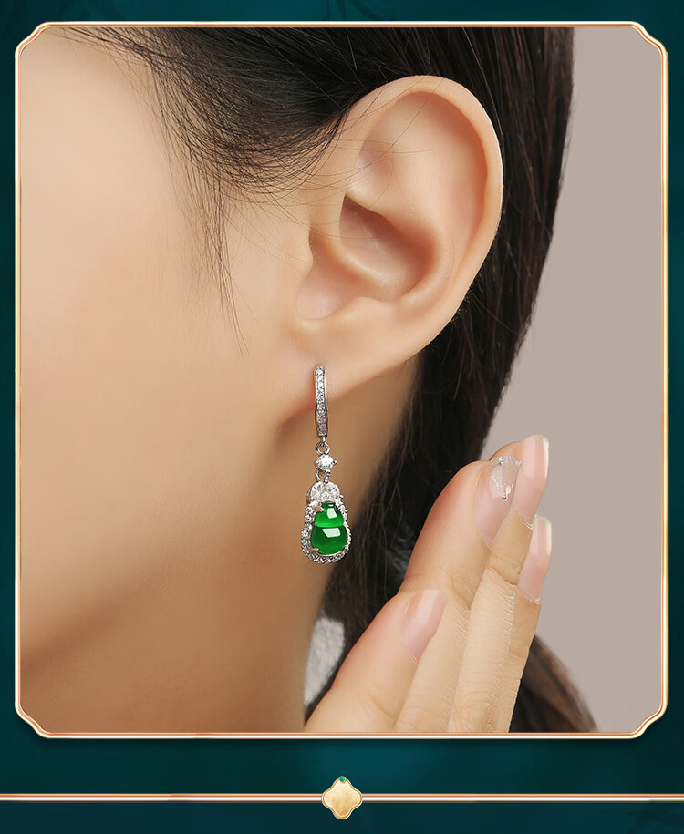 Purple glass Yang Mi's same style S925 silver inlaid with imperial green A-grade jade gourd ice earrings earrings Chinese Valentine's Day gift Imperial green jade gourd earrings