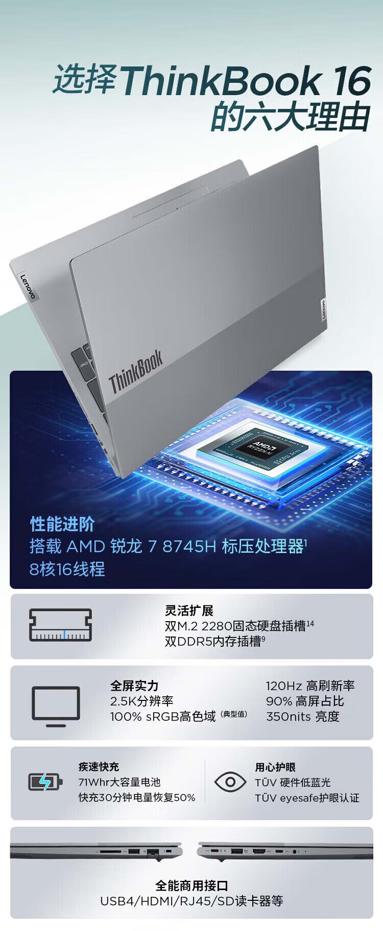 ThinkPad联想ThinkBook16+ 2025锐龙AI7H350处理器可选 高性能商务办公设计学生游戏全能笔记本电脑 定制升配:R7-8745H 32G 2T固态 16 可选3.2K+16英寸高刷