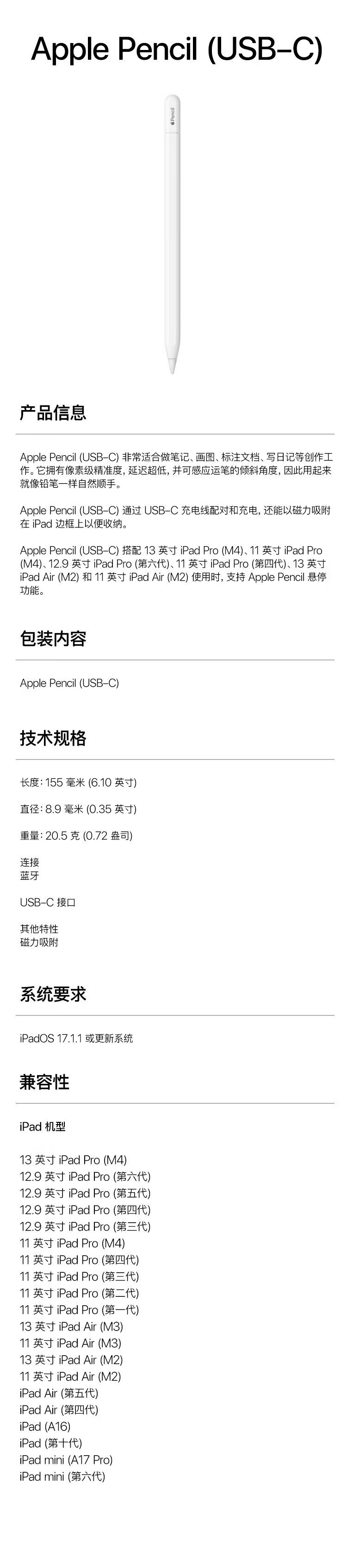 Apple/苹果 Pencil(USB-C) 磁吸触控笔手写笔苹果笔电容笔ipad笔 适用iPad 11/mini/Pro/Air