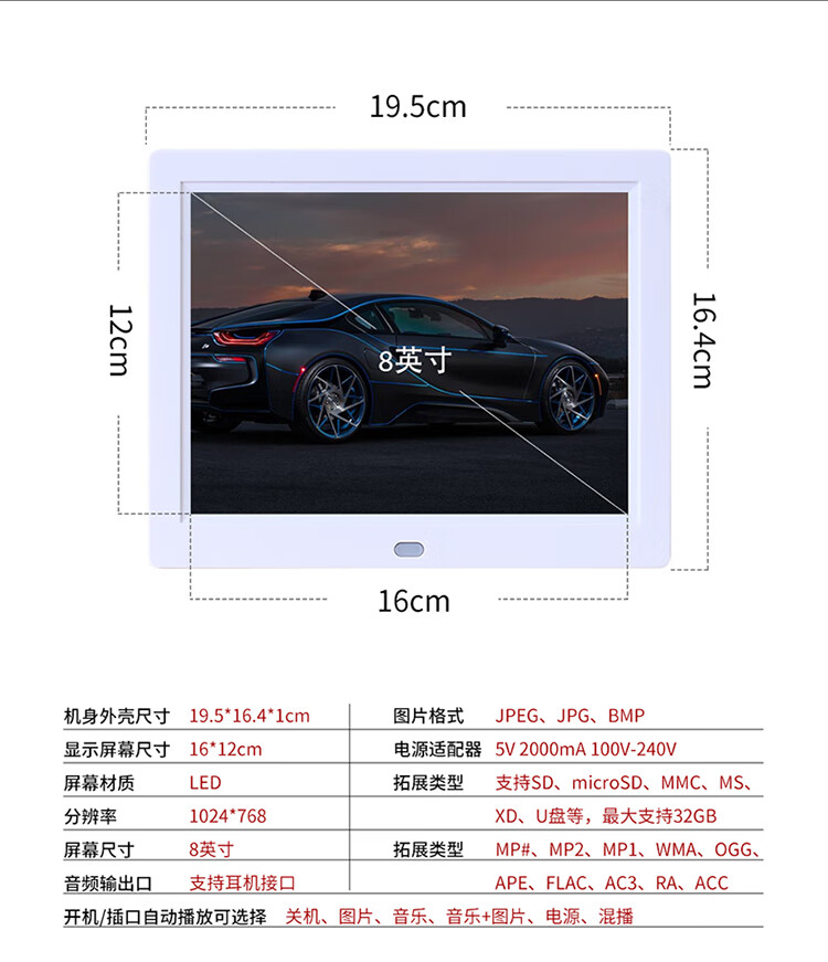 Narrow bezel 8-inch, 10-inch, 12-inch, 15-inch, 17-inch lithium battery photo frame LED screen supports high-definition video electronic photo album 8-inch plug-in without memory