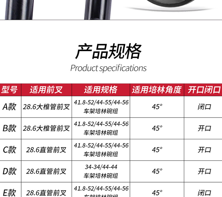 Color Classification Type a Tapered Fork Bottom (for 41.8-52/44-55/56),Type B - Open Tapered Fork Bottom (for 41.8-52/44-55/56),Type C - Open Tapered Straight Dual-Purpose Bottom (for 41.8-52/44-55/56),Type D-Straight Fork Bottom (for 34-34/44-44),Type E-Straight Fork Bottom (for 41.8-52/44-55/56