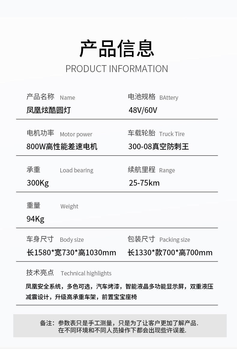 颜色分类 【炫酷600W裸车】不带电池充电器,【炫酷600W】48V12A铅酸+续航约50里,【炫酷600W】48V20A铅酸+续航约80里,【炫酷600W】48V24A黑金+续航约90里,【炫酷600W】48V20A锂电+续航约90里,【炫酷600W】60V20A铅酸+续航约90里,【炫酷600W】60V24A黑金+续航约100里,【炫酷600W】60V20A锂电+续航约100里,【炫酷600W】60V30A锂电+续航约150里,【炫酷800w】48V20A铅酸+凤凰2.0系统+续航约75里,【炫酷800w】48V24A黑金+凤凰2.0系统+续航约85里,【炫酷800w】48V20A锂电+凤凰2.0系统+续航约85里,【炫酷800w】60V20A铅酸+凤凰2.0系统+续航约85里,【炫酷800w】60V24A黑金+凤凰2.0系统+续航约95里,【炫酷800w】60V20A锂电+凤凰2.0系统+续航约95里,【炫酷800w】60V30A锂电+凤凰2.0系统+续航约130里,【炫酷1000W】60V20A铅酸+凤凰2.0系统+续航约85里,【炫酷1000W】60V24A黑金+凤凰2.0系统+续航约95里,【炫酷1000W】60V20A锂电+凤凰2.0系统+续航约95里,【炫酷1000W】60V30A锂电+凤凰2.0系统+续航约130里,【圆灯炫酷城市版】48V12A铅酸+续航约50里,【圆灯炫酷城市版】48V20A铅酸+续航约80里,【圆灯炫酷城市版】48V24A黑金+续航约90里,【圆灯炫酷城市版】48V20A锂电+续航约90里,【圆灯炫酷城市版】60V20A铅酸+续航约90里,【圆灯炫酷城市版】60V24A黑金+续航约100里,【圆灯炫酷城市版】60V20A锂电+续航约100里,【圆灯炫酷城市版】60V30A锂电+续航约150里,【圆灯炫酷乡村版】48V20A铅酸+续航约75里+凤凰2.0系统,【圆灯炫酷乡村版】48V24A黑金+续航约85里+凤凰2.0系统,【圆灯炫酷乡村版】48V20A锂电+续航约85里+凤凰2.0系统,【圆灯炫酷乡村版】60V20A铅酸+续航约85里+凤凰2.0系统,【圆灯炫酷乡村版】60V24A黑金+续航约95里+凤凰2.0系统,【圆灯炫酷乡村版】60V20A锂电+续航约95里+凤凰2.0系统,【圆灯炫酷乡村版】60V30A锂电+续航约130里+凤凰2.0系统,【圆灯炫酷越野版】60V20A铅酸+续航约85里+凤凰2.0系统,【圆灯炫酷越野版】60V24A黑金+续航约95里+凤凰2.0系统,【圆灯炫酷越野版】60V20A锂电+续航约95里+凤凰2.0系统,【圆灯炫酷越野版】60V30A锂电+续航约130里+凤凰2.0系统