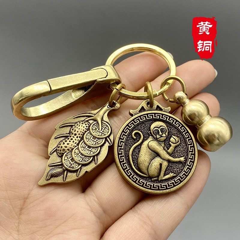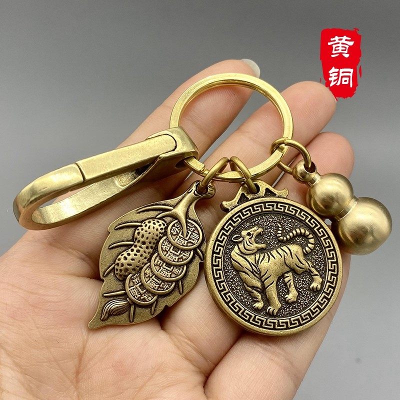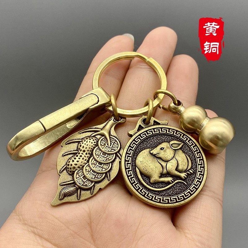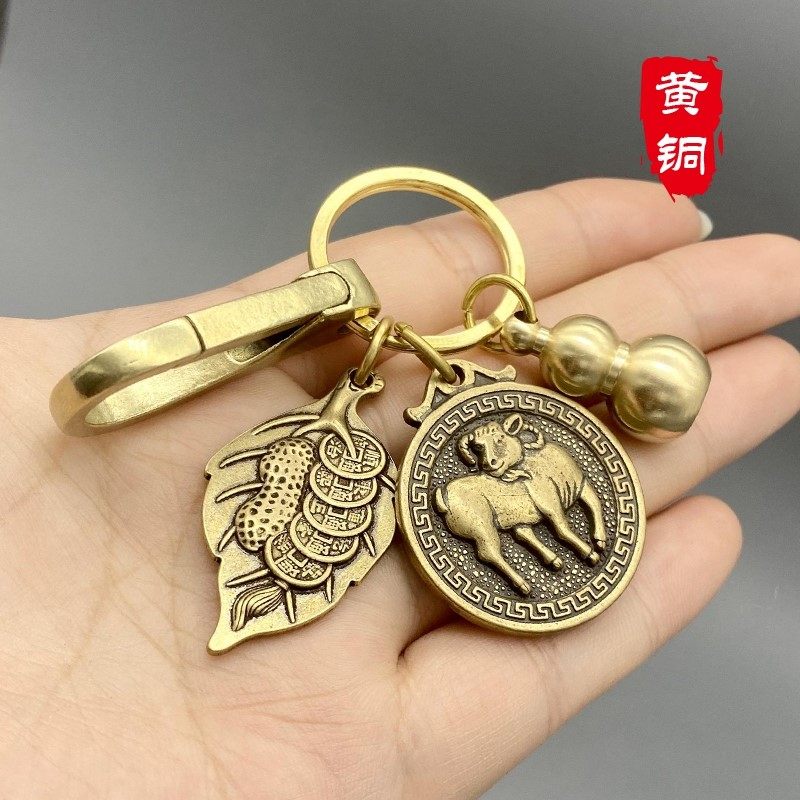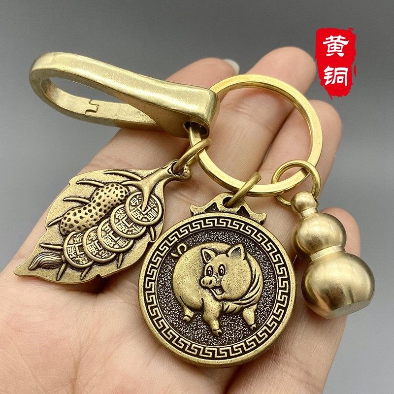 Pure Brass Twelve Zodiac Keychain, High-End, One Leaf Brings Wealth, Personalized Creative Gourd Car Pendant with Engraving for Men and Women