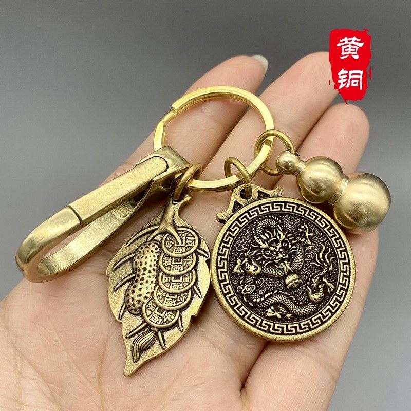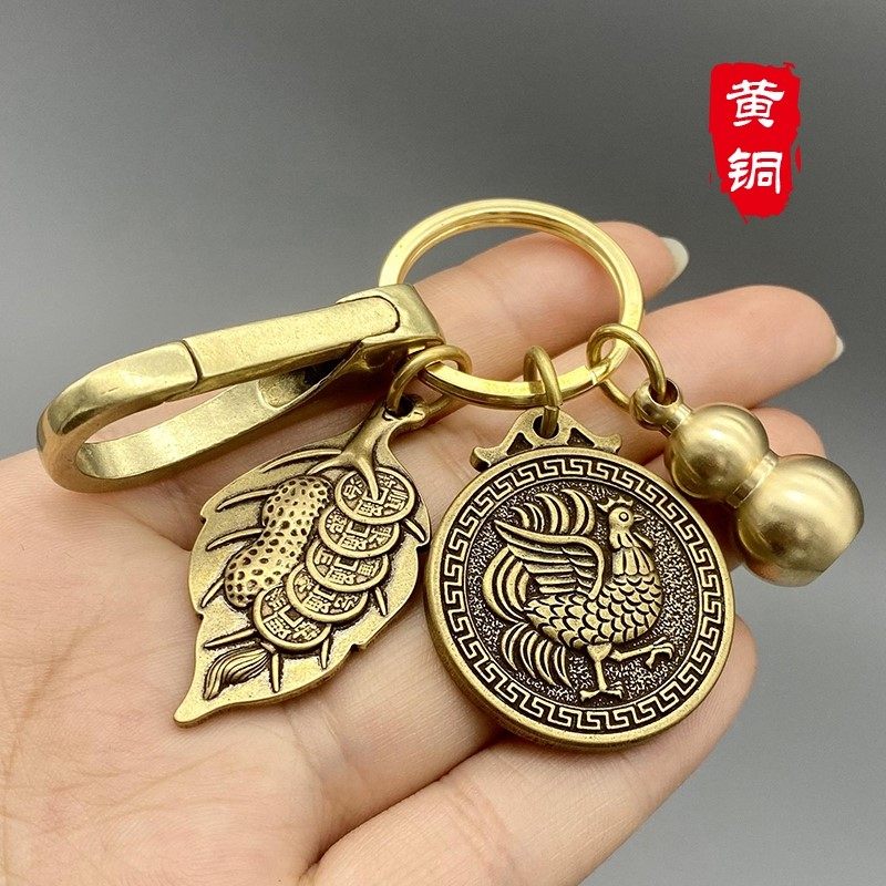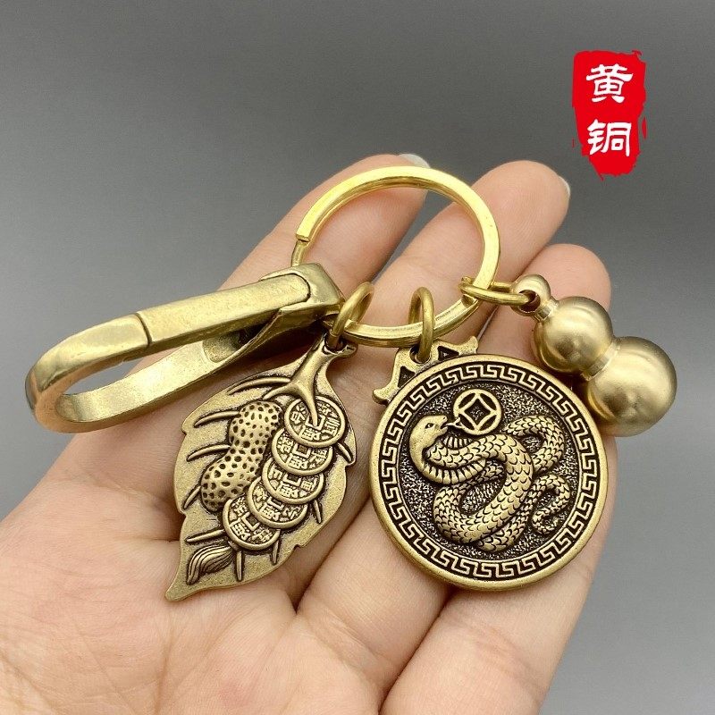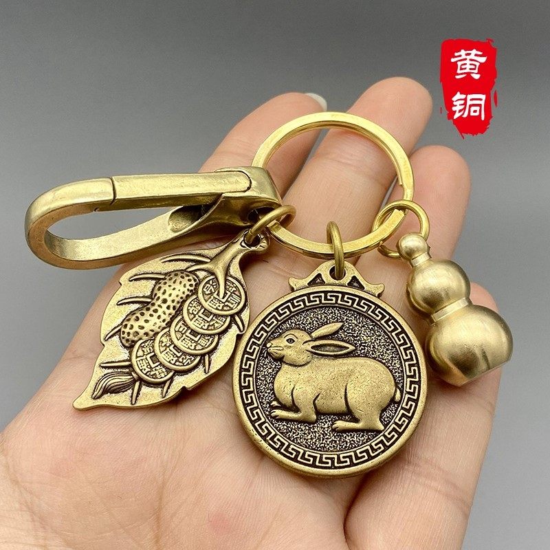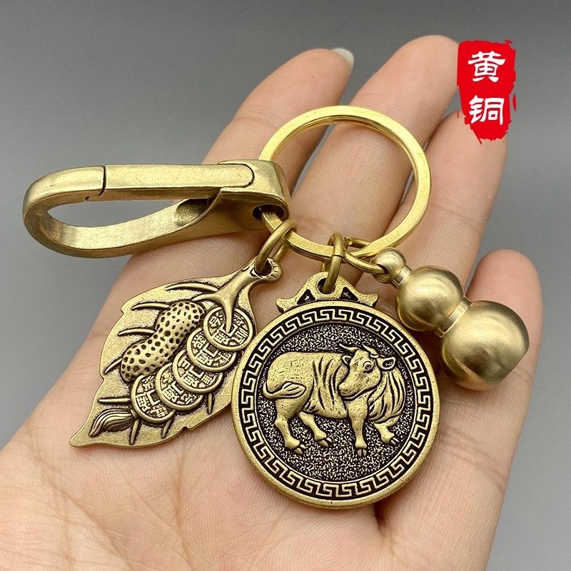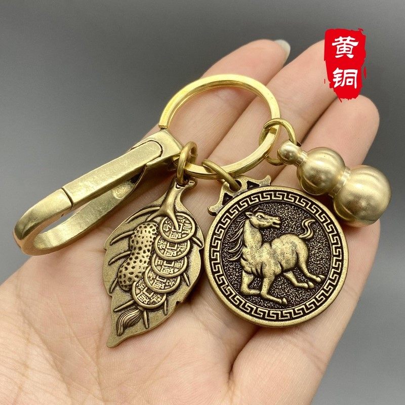 Pure Brass Twelve Zodiac Keychain, High-End, One Leaf Brings Wealth, Personalized Creative Gourd Car Pendant with Engraving for Men and Women