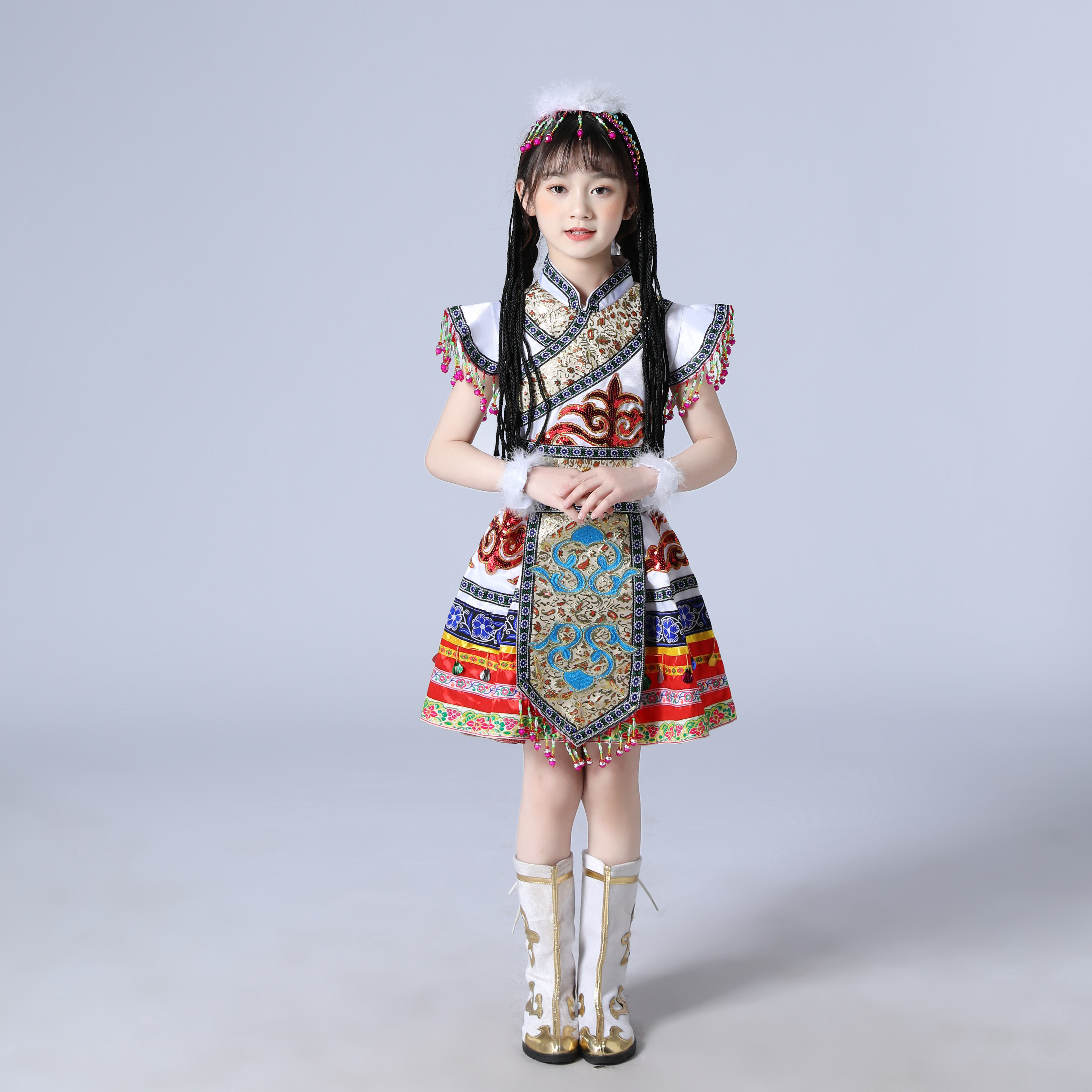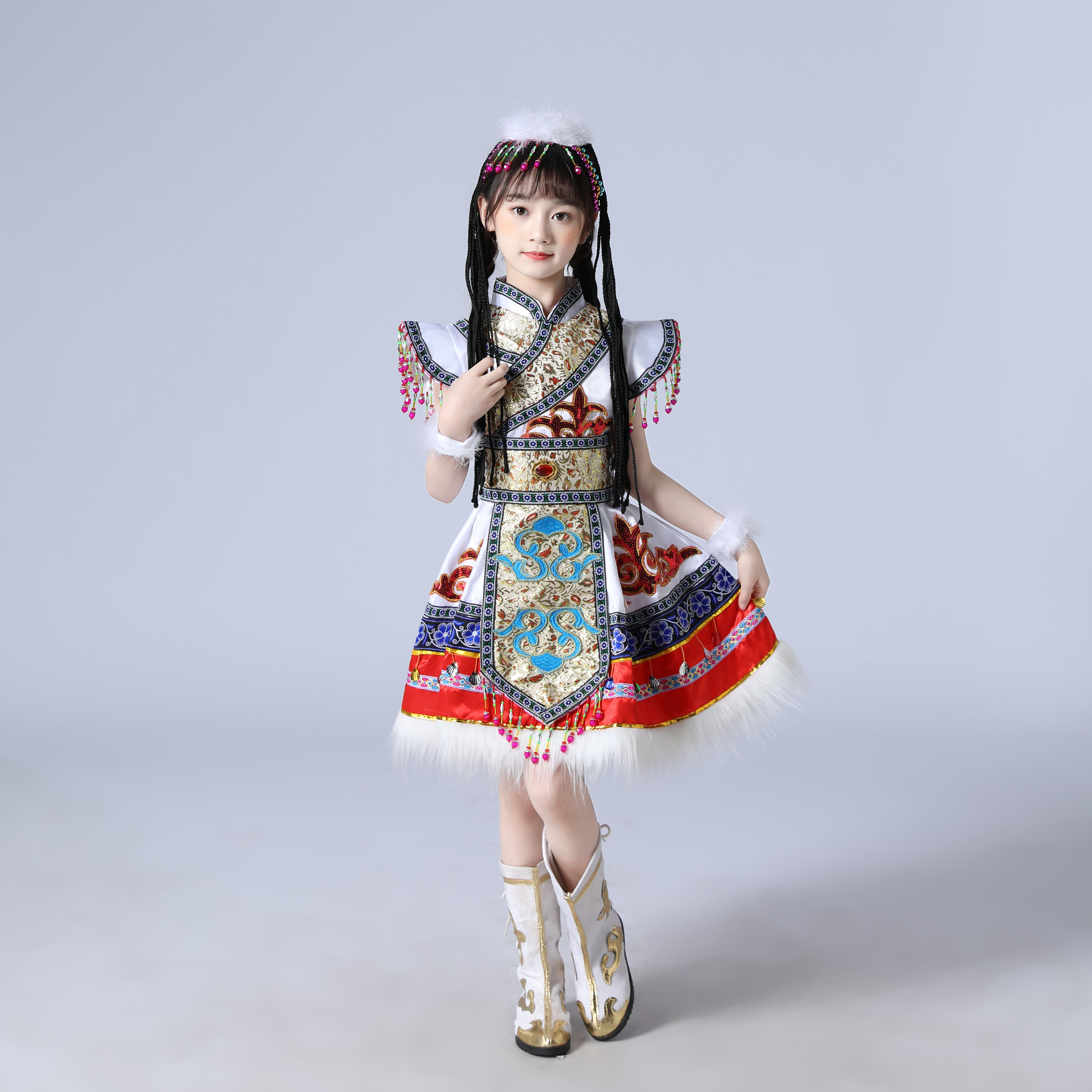 少数民族鄂伦春族服装女童舞蹈藏族传统服装鄂温克族儿童演出服饰
