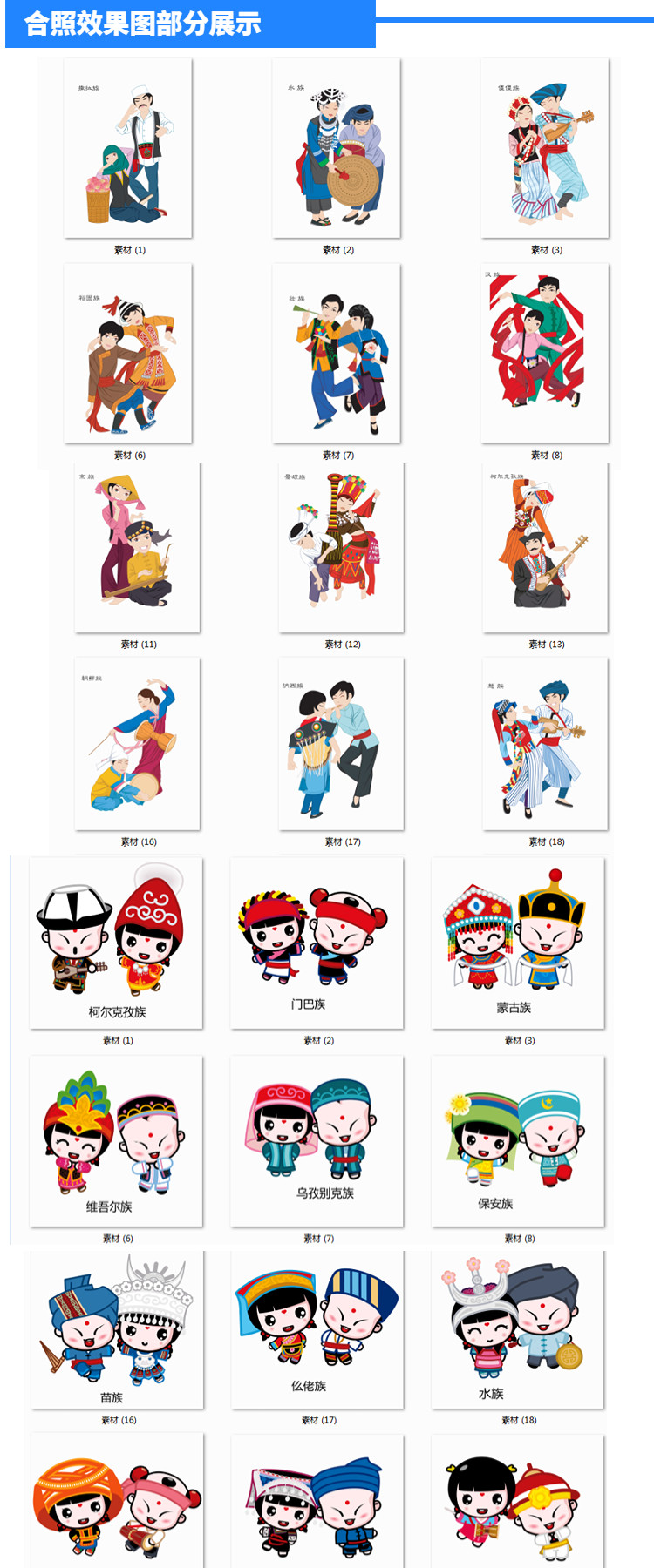 Рисованные вручную мультяшные иллюстрации 56 этнических групп, включая миао, накси и ва, в их традиционной одежде, материал для плаката в формате png