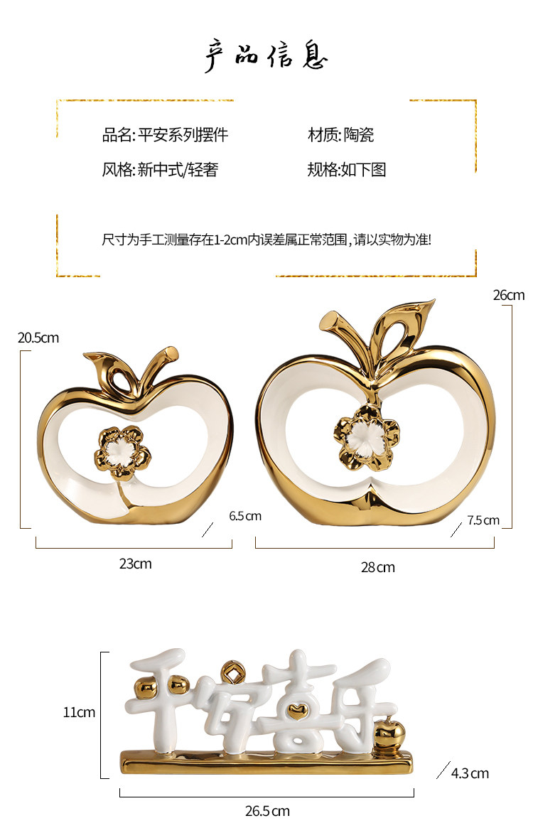 Color Classification Golden Peace & Joy Ornament + Large Apple,Golden Peace & Joy Ornament + Small Apple,Platinum - Peace & Joy Ornament + Platinum - Large Apple,Platinum - Peace & Joy Ornament + Platinum - Small Apple,Orange Gold - Large Apple + Gold Peace & Joy Ornament,Orange Gold - Small Apple + Gold Peace & Joy Ornament,Platinum - Creative Large Apple + Gold Peace & Joy,Platinum - Creative Small Apple + Gold Peace & Joy,Peace and Joy (White),Peace and Joy (Gold),Platinum - Apple Pair,Platinum-Large Apple,Platinum-Small Apple,Orange Gold-Apple Pair,Orange Gold-Large Apple,Orange Gold-Small Apple,A Pair of Creative Apple Ornaments (White),Creative Apple Large (White),Creative Apple Small (White),Three Cabinet Grid Decoration Combination a,Three Cabinet Grid Decoration Combination B,Three Cabinet Grid Decoration Combination C,Four Cabinet Compartment Decoration Combination D,Living Room Decoration Set E-6 Pieces,Living Room Decoration Combination F-5 Piece Set,Living Room Cabinet Decoration Combination G-5 Piece Set,5-Piece Tv Side Cabinet Combination Set (2 Books Sent Randomly),Tv Side Cabinet Set of 6 Pieces (2 Books Sent Randomly),Tv Side Cabinet Combination 6-Piece Set (Excluding Wine Bottles),Five Cabinet Grid Ornaments Combination O,7-Piece Living Room Decoration Set (2 Books Sent Randomly),Tv Cabinet Ornaments Combination 7-Piece Set,Double Row Cabinet Set of 13 Pieces (2 Books Sent Randomly),Ornaments - a Pair of Gourd Ornaments,A Pair of Lifelike Ornaments,Yuanbao Fu Ornaments,Platinum - Peace & Joy Ornament + Gourd Pair,Platinum-Peace and Joy Ornaments + Tall Gourd,Platinum - Peace & Joy Ornament + Short Gourd,Peace and Joy Ornaments + Daji Vase (Fortune Fruit 4 Ginkgo Leaves 2) Free Pendant,Peace and Joy Ornaments + Joy Vase (4 Fortune Fruits and 2 Ginkgo Leaves) Free Pendant,Joyful Vase (Fortune Fruit 4 Ginkgo Leaves 2) Comes with Pendant,Daji Vase (Fortune Fruit 4 Ginkgo Leaves 2) Comes with Pendant