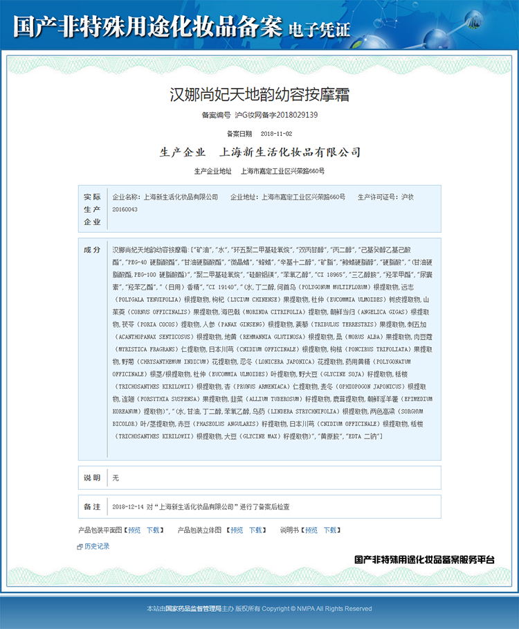 新生活化妆品专柜正品官方旗舰店汉娜尚妃天地韵幼容按摩霜面部膏