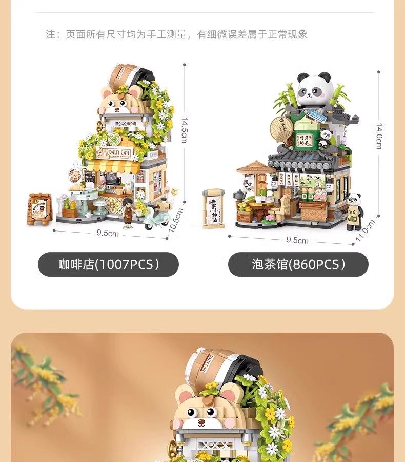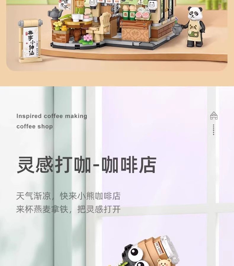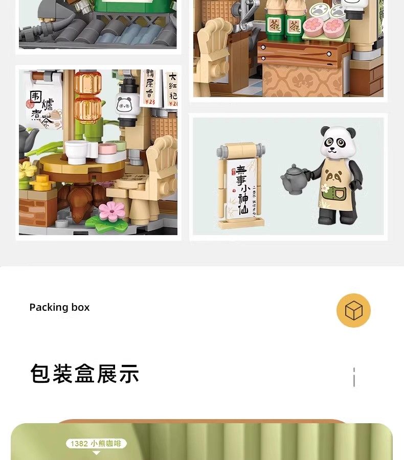 Color Classification 1383 Panda Tea House,Panda Tea House [860 Pieces] + Lighting,1383 Panda Tea House + Display Box with Light,1382 Little Bear Coffee,Little Bear Cafe [1007 Pieces] + Lighting,1382 Little Bear Coffee + Display Box with Light,1383 Panda Tea House + 1382 Little Bear Coffee,7211/Small Rake Christmas Shop,7212/Small Rake Gingerbread Coffee,1377/Big Orange Cat Club,1378/Heartfelt Gift Shop,7201/Small Rake Taiyaki,7202/Xiaohua Flower Shop,1388/Retro Stove,1389/Tea Combination,1390/Sweetheart Set,1391/Gourmet Platter,Stove Tea Making Set 1388-1391,1290 Granny's Snack Shop,1291/Ya Ji Bbq,1292/Seafood Food Stall,1293/Stone Ground Rice Roll Shop,Food City Fortress 1290-1293,1942 Second Brother Pork Dried Pork,1943 Bee House,1294 Lemon Tea Shop,1295 Snail Noodle Shop,1294 Lemon Tea Shop + 1295 Snail Noodle Shop,1260/Shrimp Shaomai King,1261/Gold Medal Shrimp Dumpling King,1262/Steamed Chicken Feet with Bean Sauce,1263/Piglet Cream Bun,1264/Fresh Shrimp Rice Rolls,1266/One Sight of Love,1267/ Lotus Rice Chicken,1243 Station,1244 Grocery Store,1245 Cactus,1246 Cactus,1218 Takoyaki,1219 Shaved Ice Shop,Takoyaki + Shaved Ice Shop + Display Box,1231 Aquatic Products Store,1232 Izakaya,Fish Shop + Izakaya + Display Box,Japanese Street Scene/Four Styles,1126 Sakura Swing,Dwarf Cabin,1281 Farmhouse,Display Box 20*10*15,1942 Second Brother Pork Dried Pork + 1943 Bee Shop