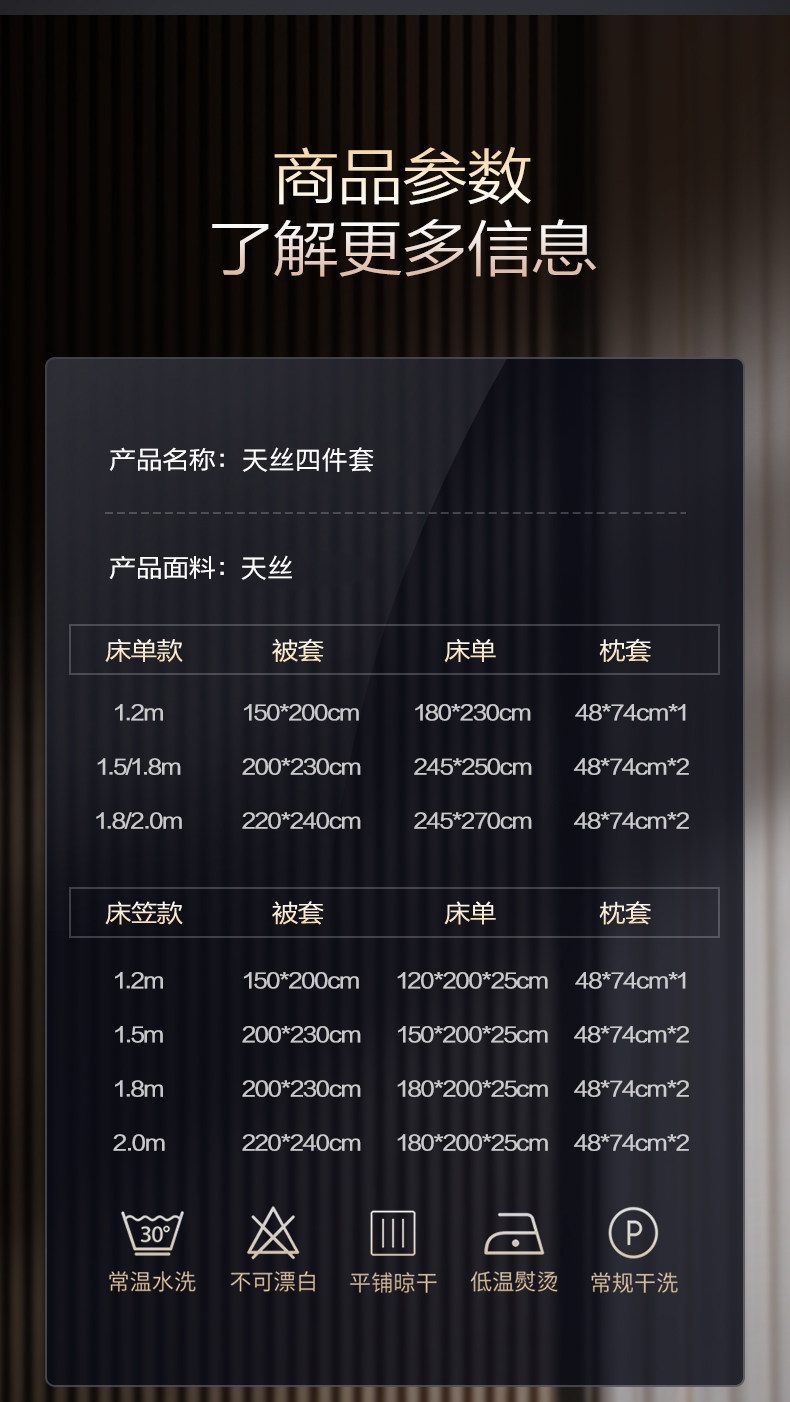尺寸 单被套-150*200cm【建议拍2套换洗】,单被套-200*230cm被子【建议拍2套换洗】,单被套-220*240cm被子【建议拍2套换洗】,1.2m床单款三件套【适合150*200cm被子】,1.5m床单款四件套【适合200*230cm被子】,1.8m床单款四件套【适合200*230cm被子】,2.0m床单款四件套【适合220*240cm被子】,1.5m床笠款四件套【适合200*230cm被子】,1.8m床笠款四件套【适合200*230cm被子】