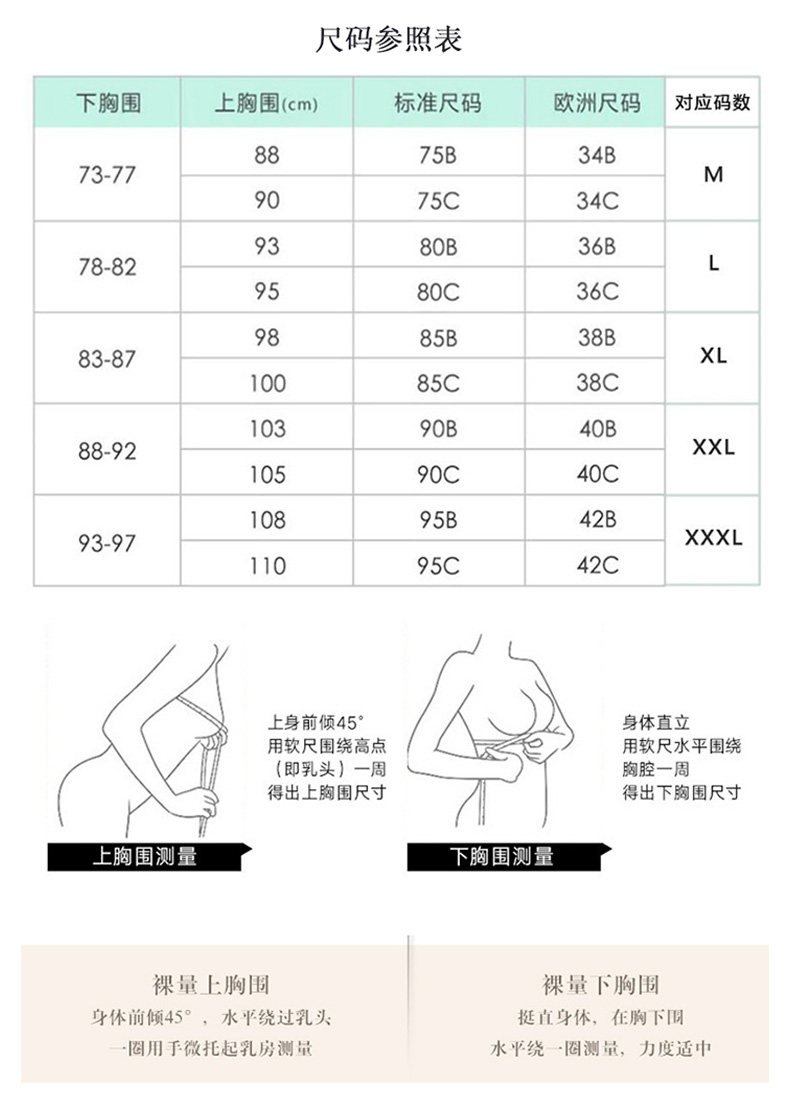 Size 80/36 Bc through Cup (Recommended 50-60kg),85/38 Bc through Cup (Recommended 60-70kg),90/40 Bc through Cup (Recommended 70-80kg),95/42 Bc through Cup (Recommended 80-90kg)