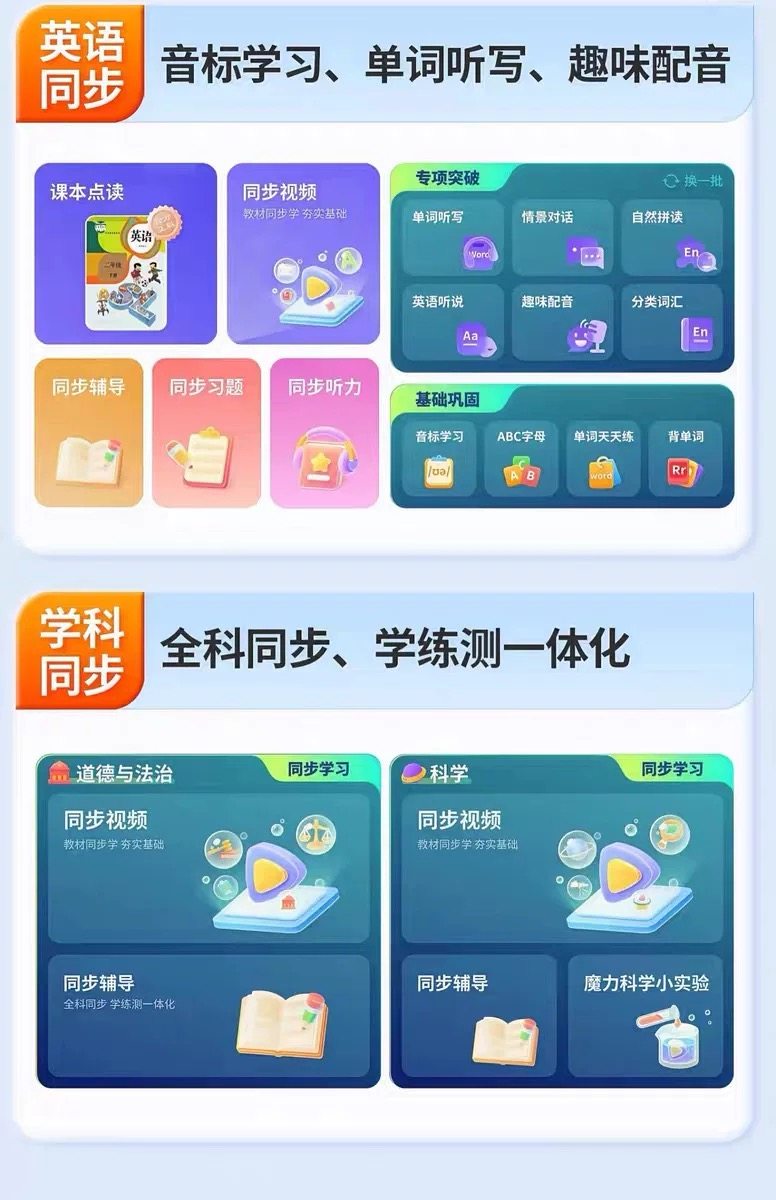 附加功能 支持电子书阅读,真人发音,MP4,支持屏幕手写,支持扩展存储卡,家长监控,通话功能,摄像头功能,点读功能,MP3