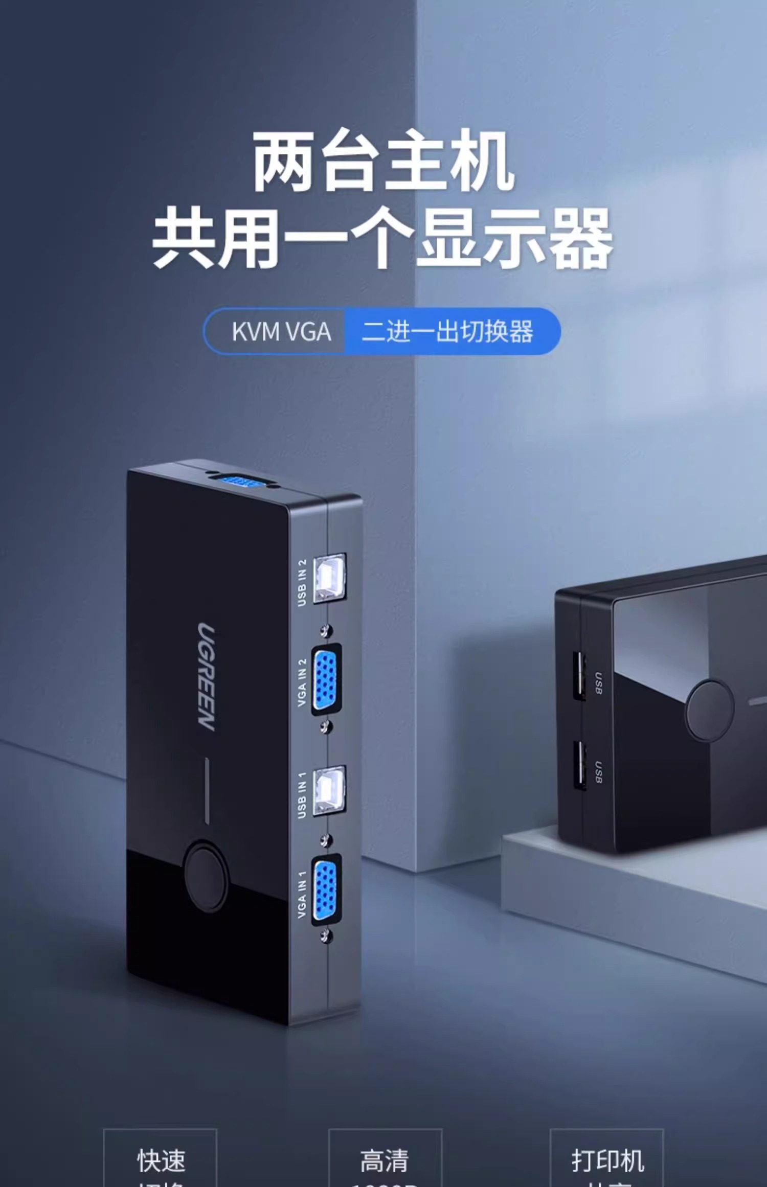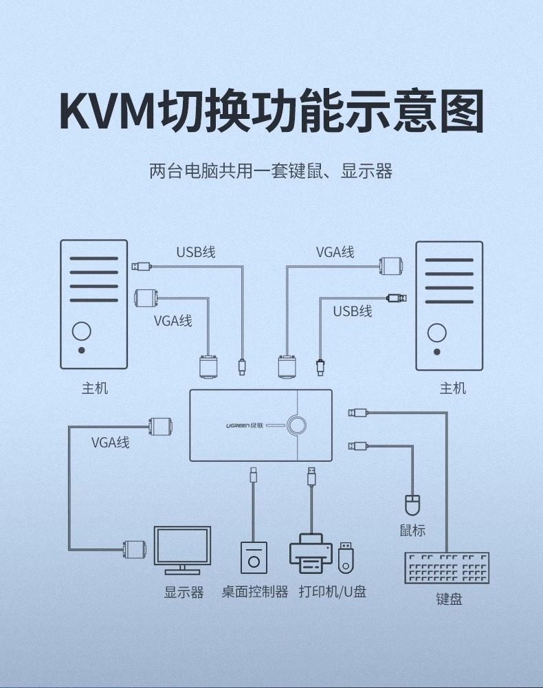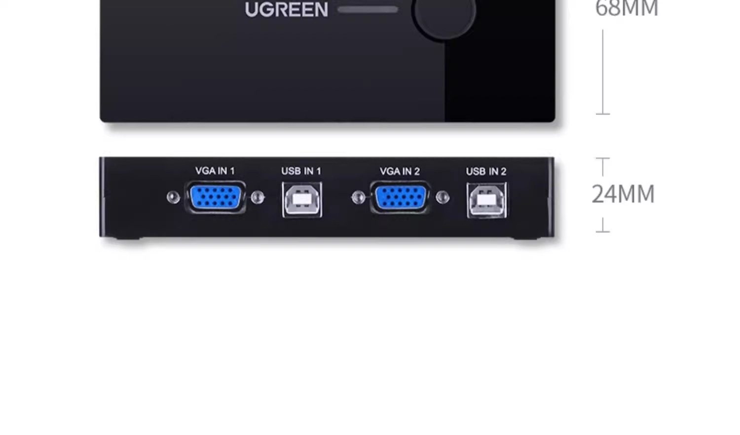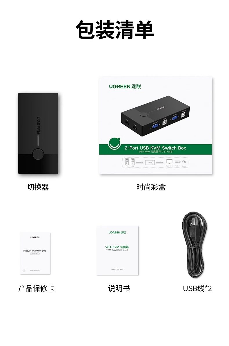 Clasificación de colores 2 entradas y 1 salida: conmutador KVM estándar con botones (con 3 puertos USB),El paquete estándar viene con 1 cable VGA de 1 metro,El paquete estándar viene con 2 cables VGA de 1 metro