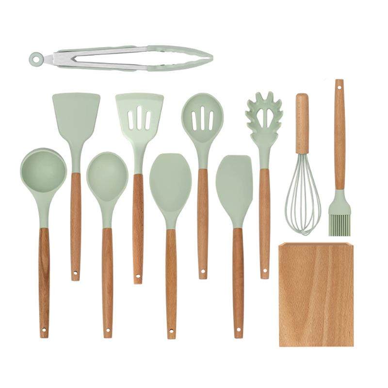 Utensilios de cocina de silicona, juego de 12 piezas, mango de madera, cuchara de cocina, pala, utensilios de cocina de madera, cubo, utensilios de cocina, espátula para verduras, juego de cucharas para sopa