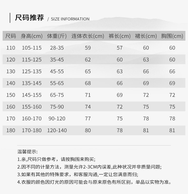 尺码 180,110,120,130,140,150,160,170