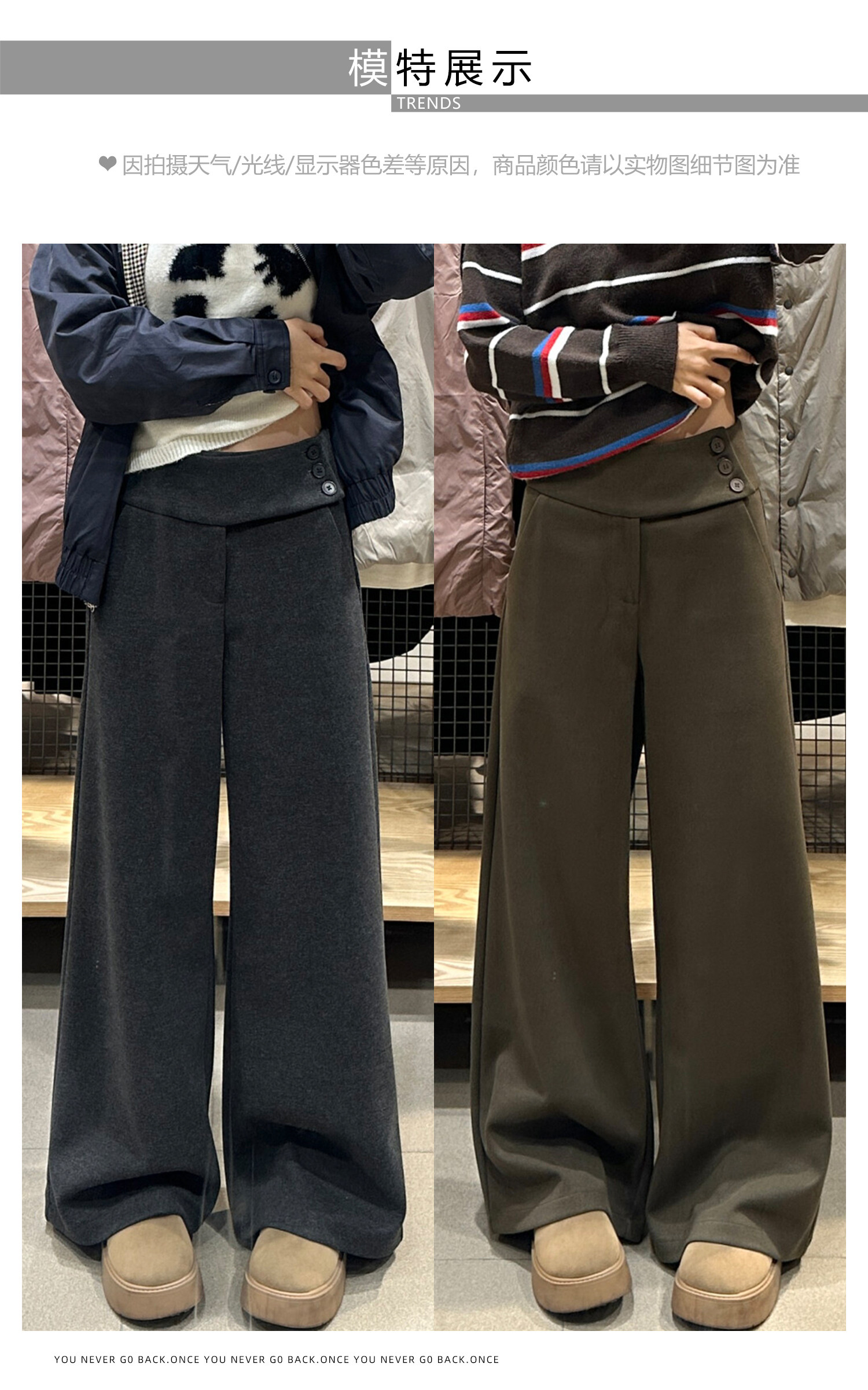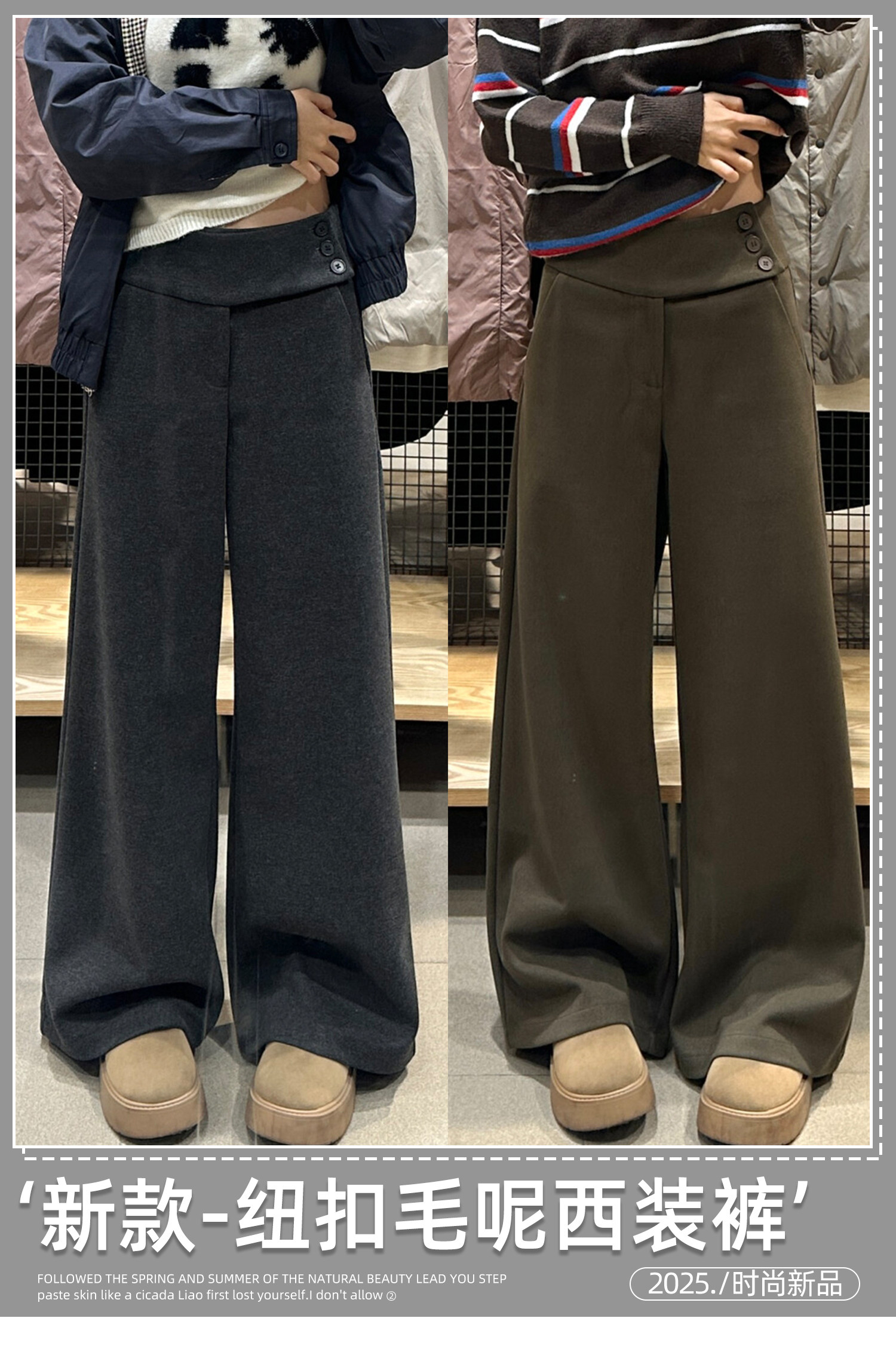 Retro dark gray woolen wide-leg pants for women in autumn and winter, low-waisted, lazy, slim, casual floor-length buttoned suit pants