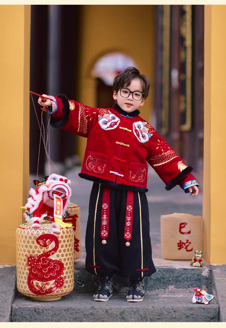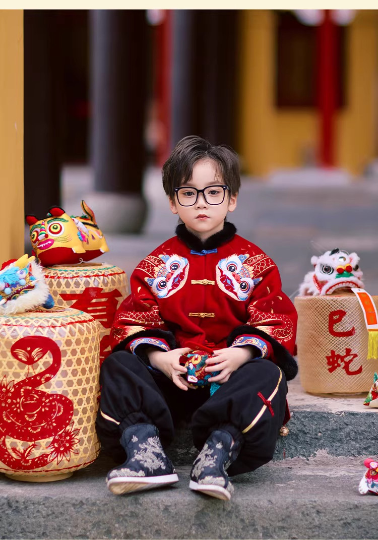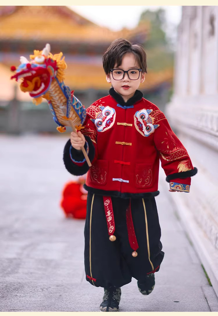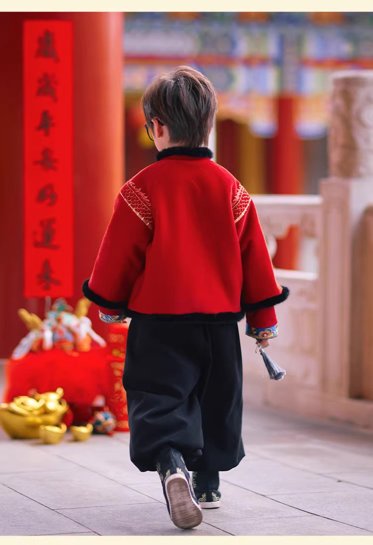 男生冬季新款中国风唐装儿童厚款喜庆洋气喜庆汉服两件套拜年服