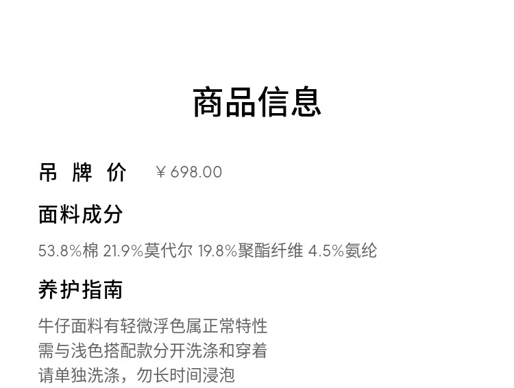 Materialzusammensetzung Baumwolle 53,8 % Modalfaser (Modal) 21,9 % Polyesterfaser 19,8 % elastische Polyurethanfaser (Spandex) 4,5 %