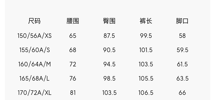 Outseam (cm) 99 cm 101.5 cm 104 cm 106.5 cm 109 cm