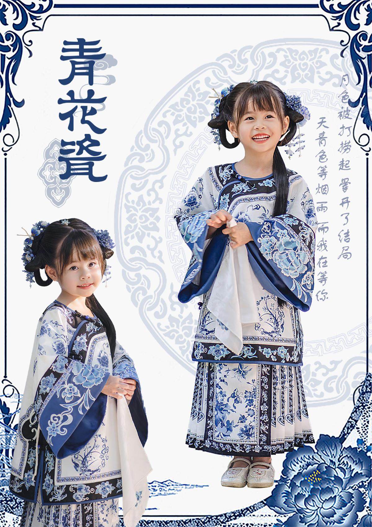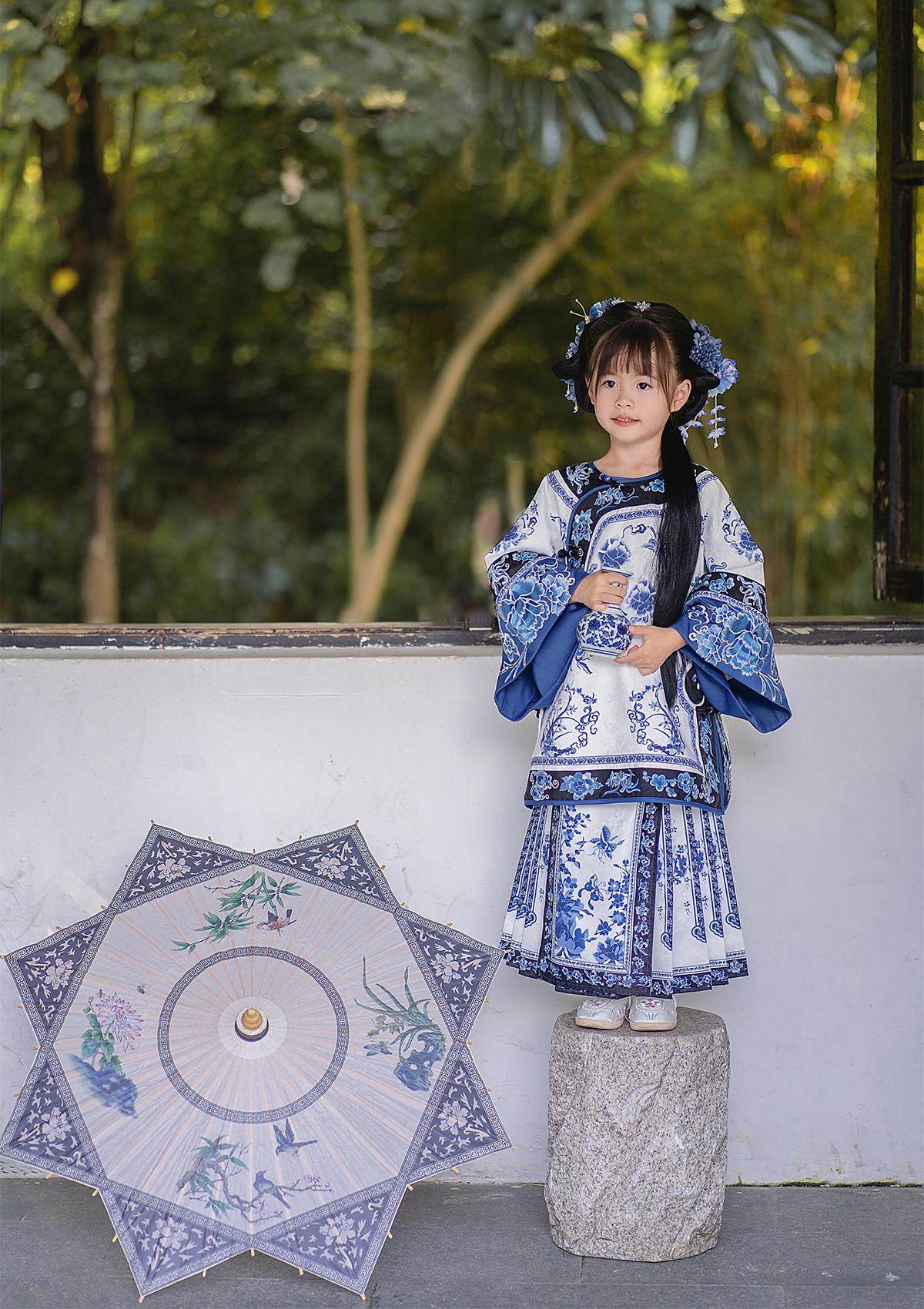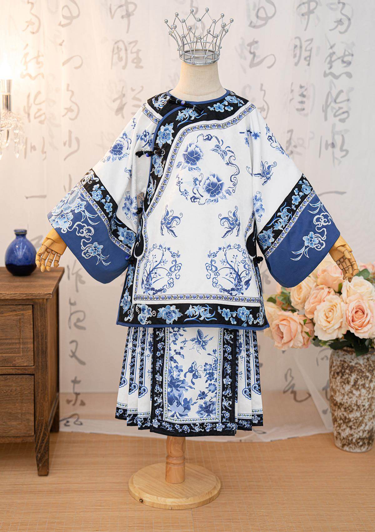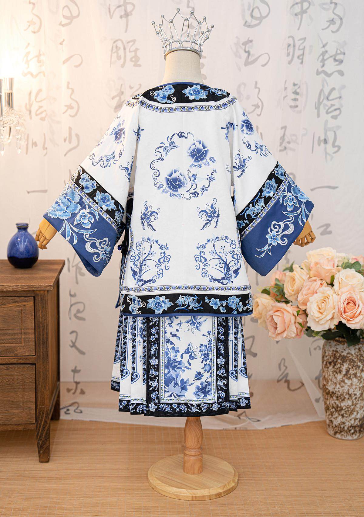 Girls Manchu Chinese Han Dynasty Blue and White Porcelain Qing Dynasty Checkered Skirt Spring and Autumn Qing Han Female Pioneer Grandma Little Princess Skirt