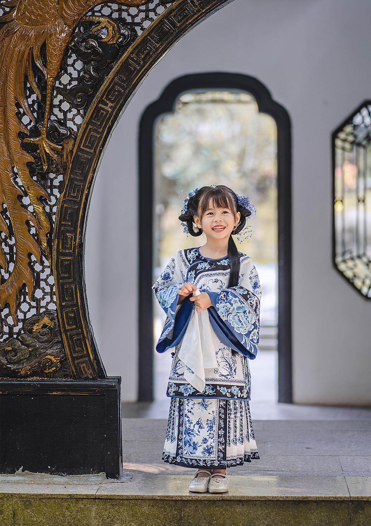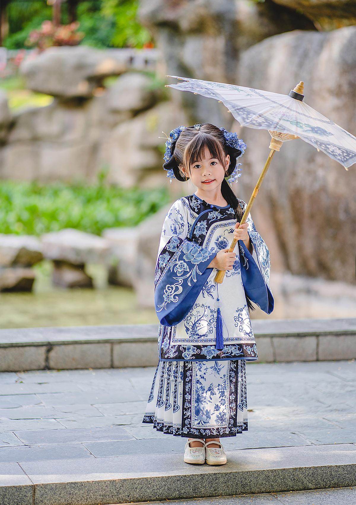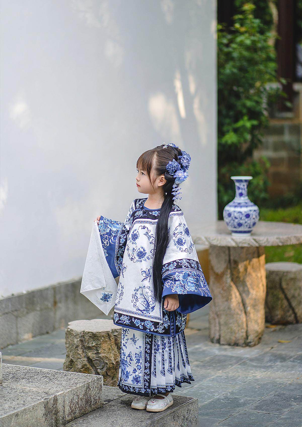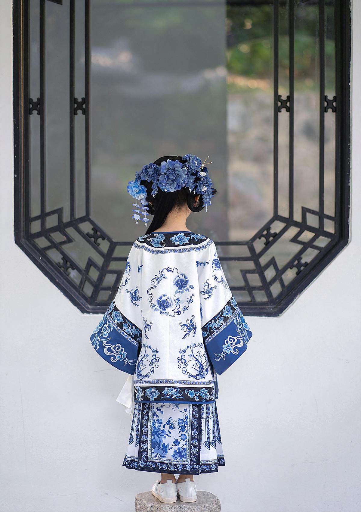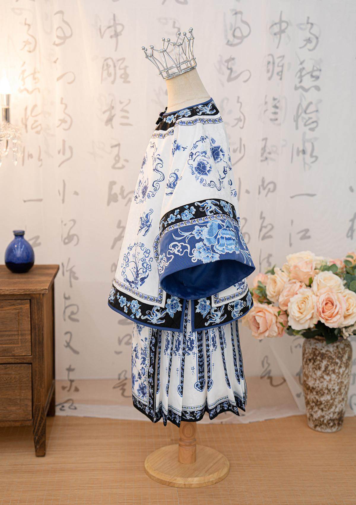 Girls Manchu Chinese Han Dynasty Blue and White Porcelain Qing Dynasty Checkered Skirt Spring and Autumn Qing Han Female Pioneer Grandma Little Princess Skirt