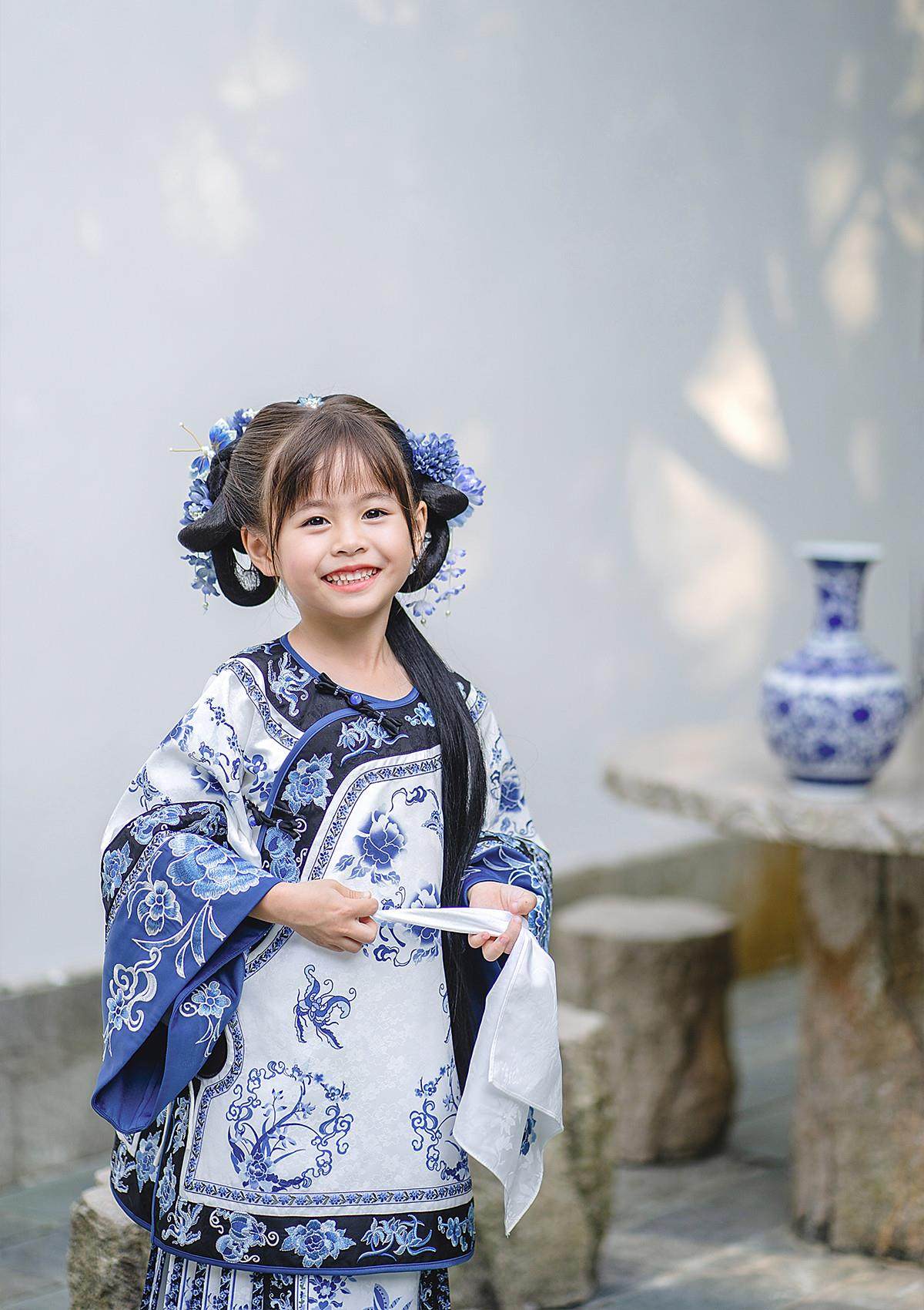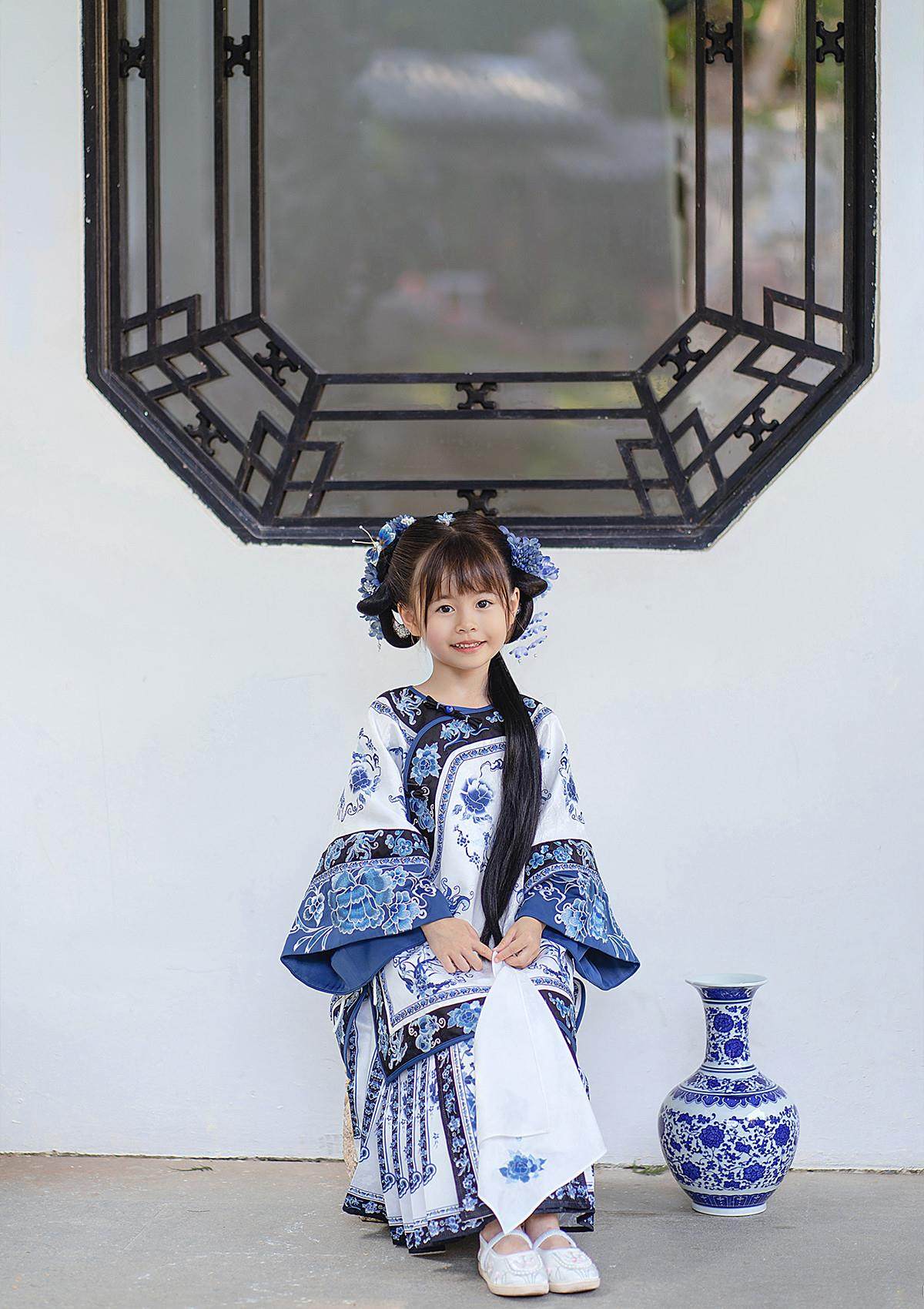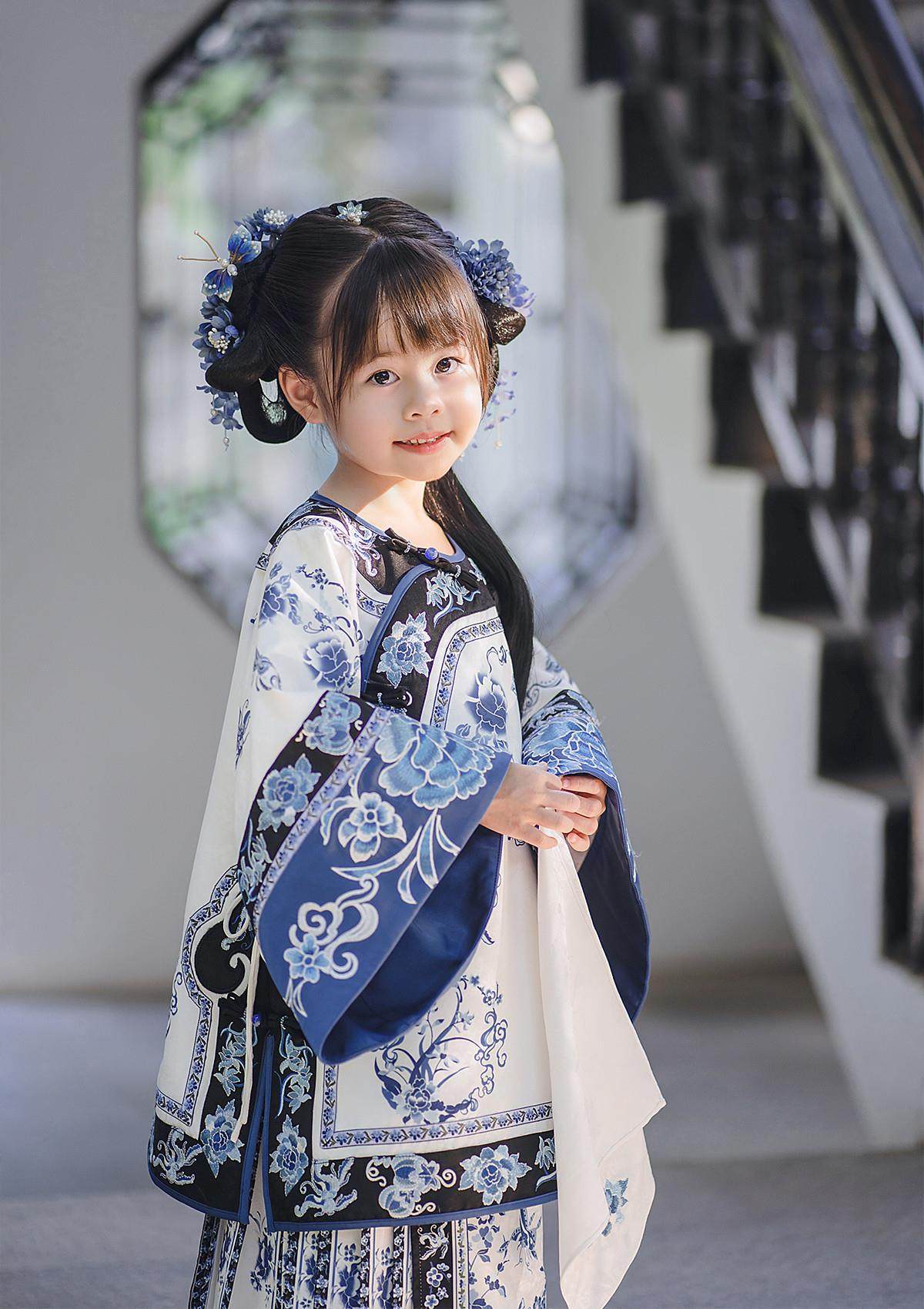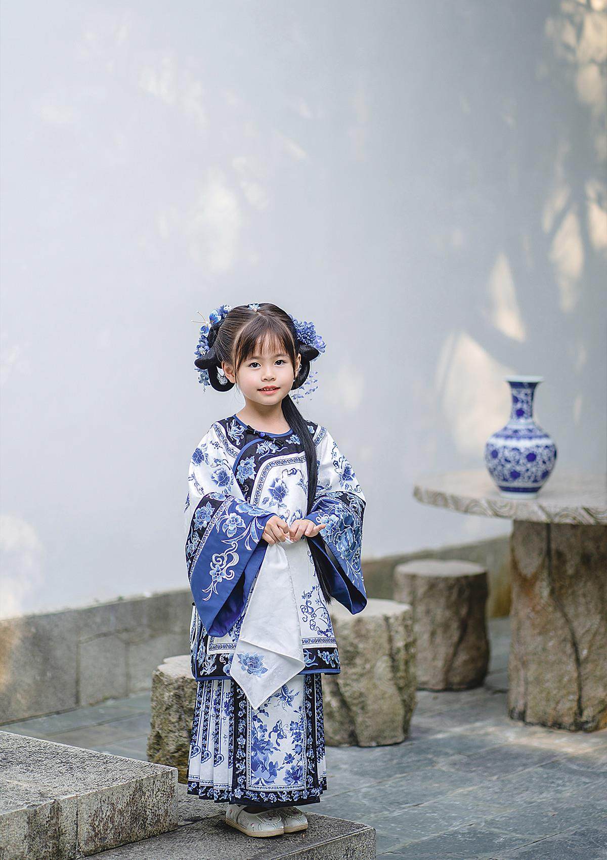 Girls Manchu Chinese Han Dynasty Blue and White Porcelain Qing Dynasty Checkered Skirt Spring and Autumn Qing Han Female Pioneer Grandma Little Princess Skirt