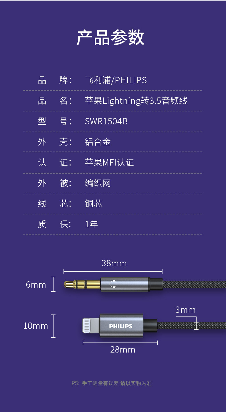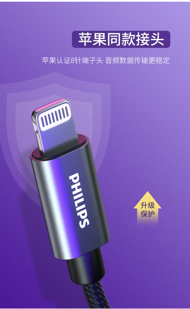 飞利浦aux音频线适用苹果连接车用车载听歌iPhone手机转接头汽车音响音箱lightning转3.5mm耳机双头输出转换