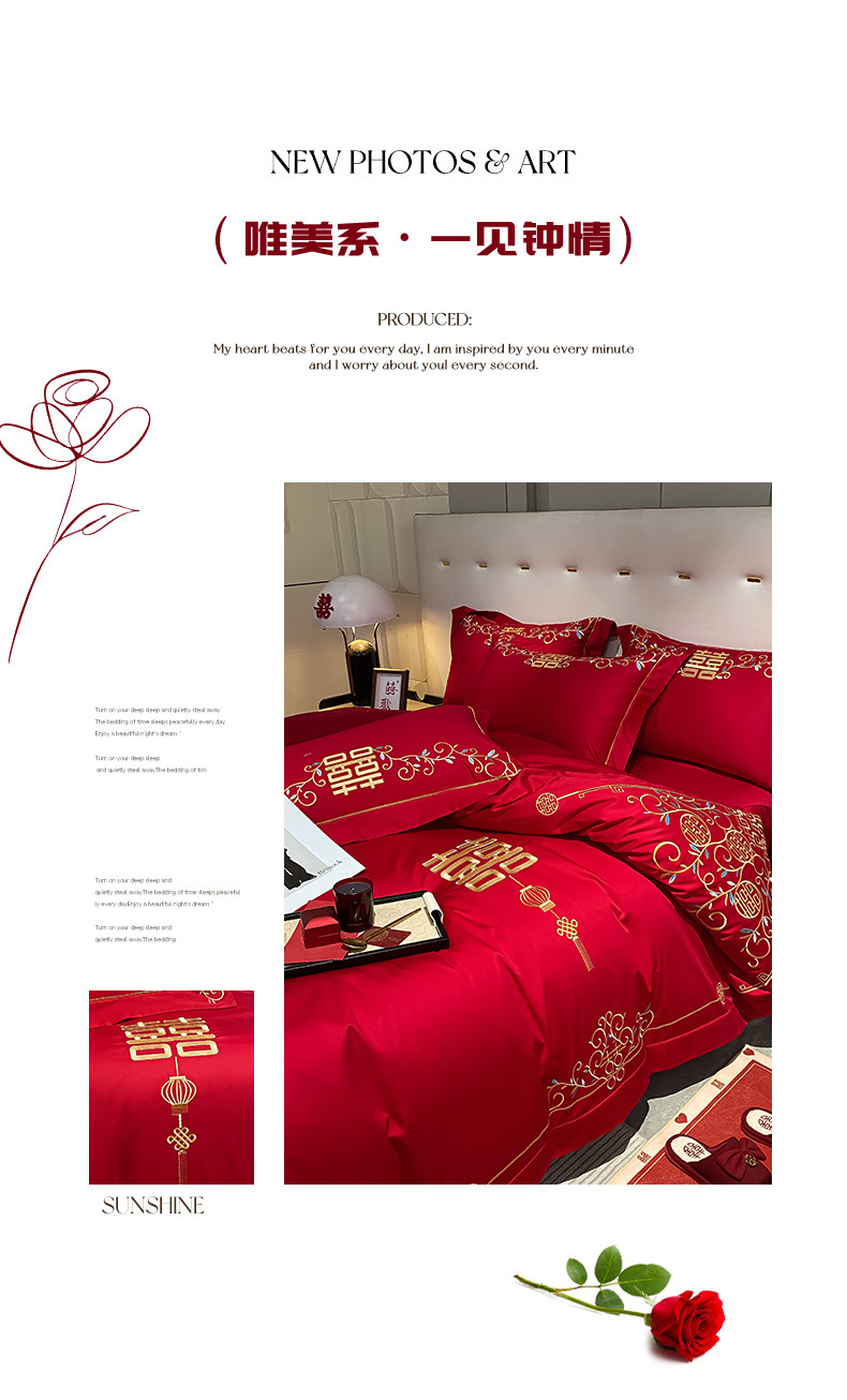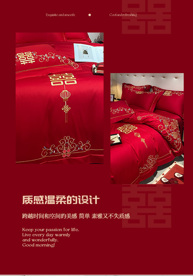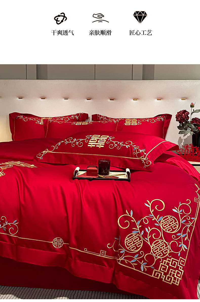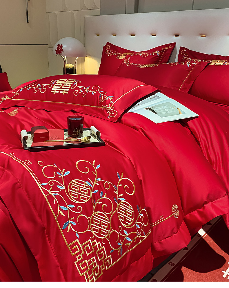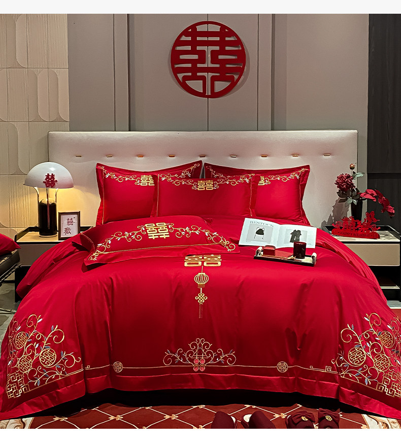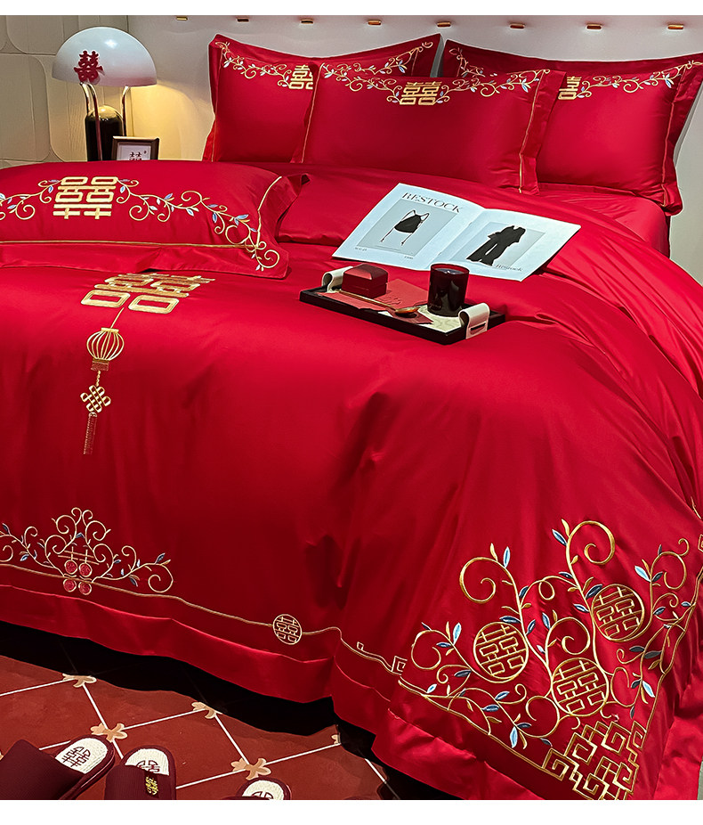 Juego de cuatro piezas de ropa de cama de algodón puro rojo para boda, edredón de boda de algodón de alta gama, sábanas de cubierta de edredón de boda