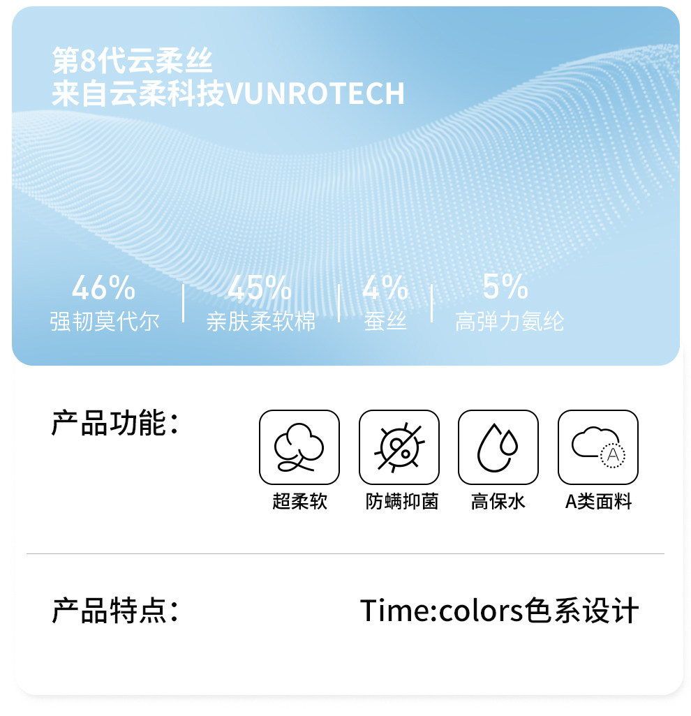 Fabric Material Composition Modal Fiber (Modal) 46% Cotton 45% Polyurethane Elastic Fiber (Spandex) 5% Mulberry Silk 4%