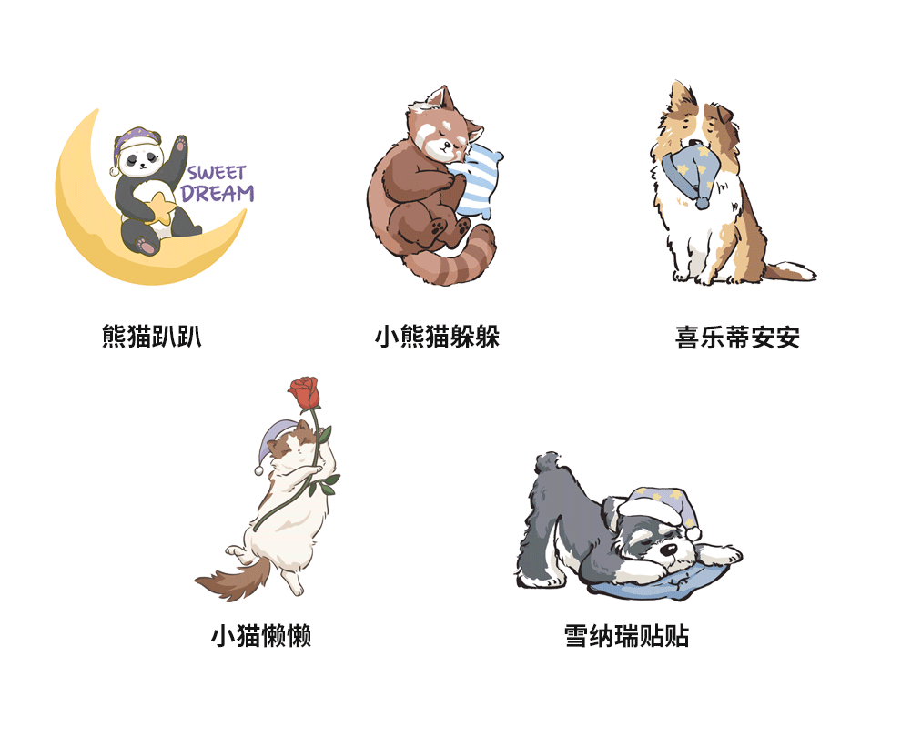 颜色分类 女-小猫懒懒,女-熊猫趴趴,女-小熊猫躲躲,男-雪纳瑞贴贴,男-熊猫趴趴,男-喜乐蒂安安