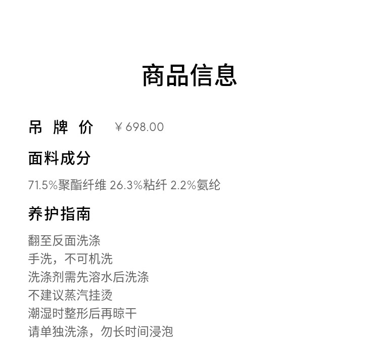Material Composition Polyester Fiber 71.5% Viscose Fiber (Viscose Fiber) 26.3% Polyurethane Elastic Fiber (Spandex) 2.2%