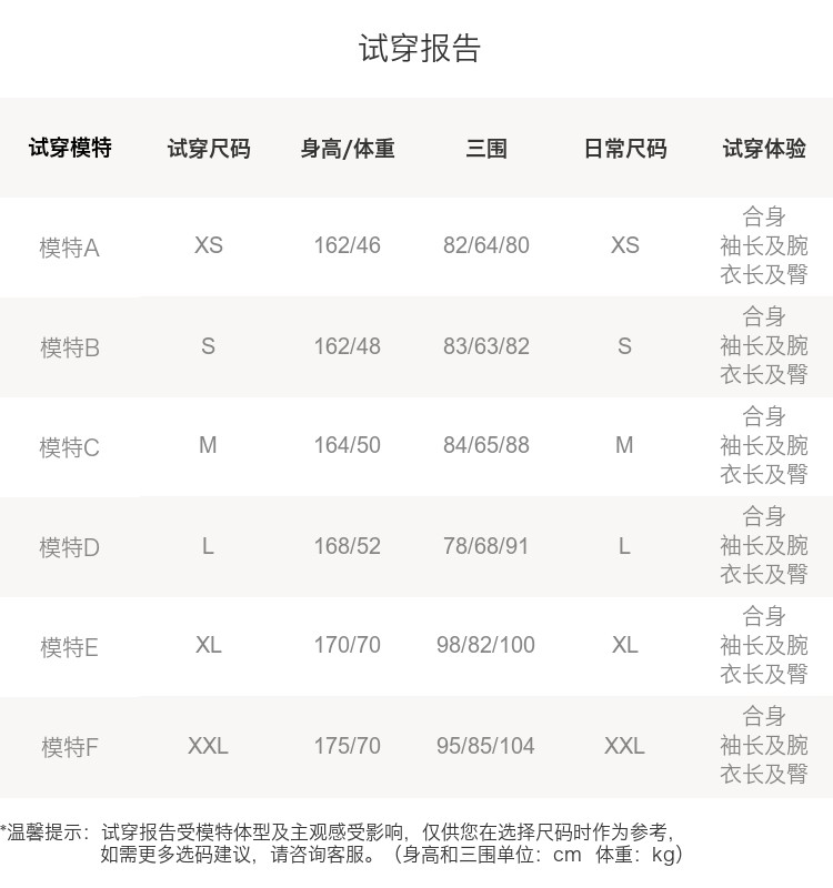 China (cm) 160-165/84-86 165-170 / 88-90 167-172 / 92-96 168-173 / 98-102 170-176 / 106-110