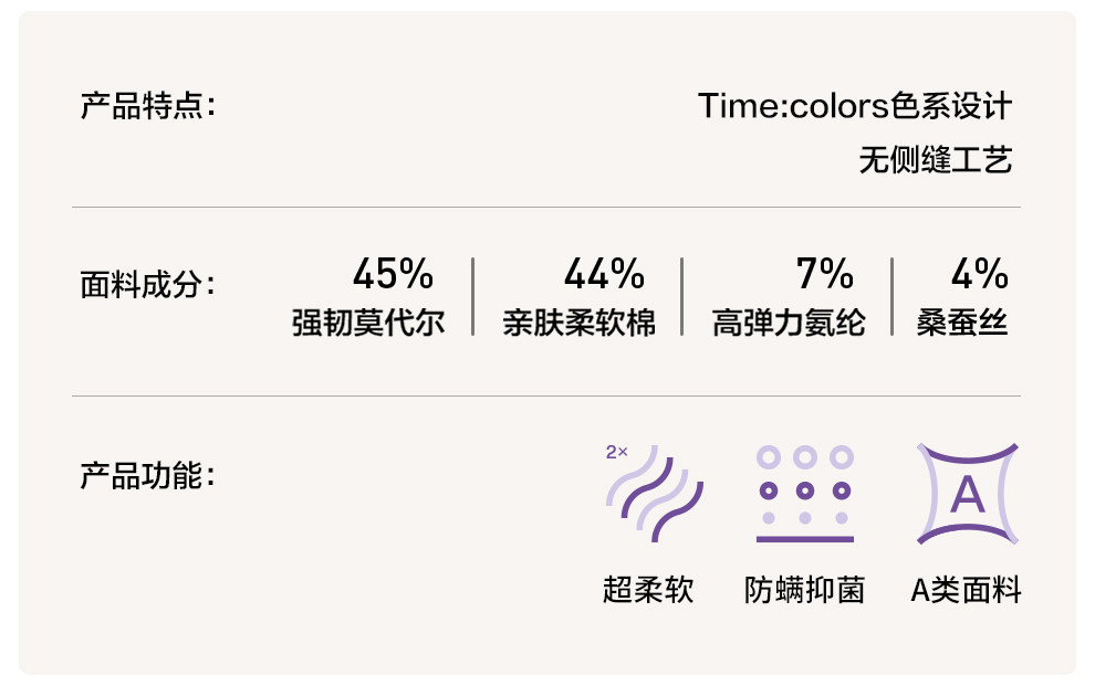 Fabric Material Composition Modal Fiber (Modal) 45% Cotton 44% Polyurethane Elastic Fiber (Spandex) 7% Mulberry Silk 4%