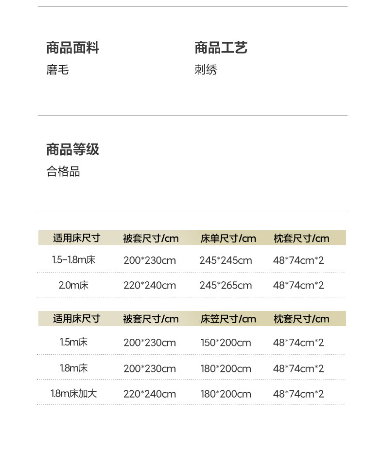 适用床尺寸 1.5m床单款四件套【适合200*230cm被芯】,1.8m床单款四件套【适合200*230cm被芯】,2.0m床单款四件套【适合220*240cm被芯】,1.5m床笠款四件套【适合200*230cm被芯】,1.8m床笠款四件套【适合200*230cm被芯】