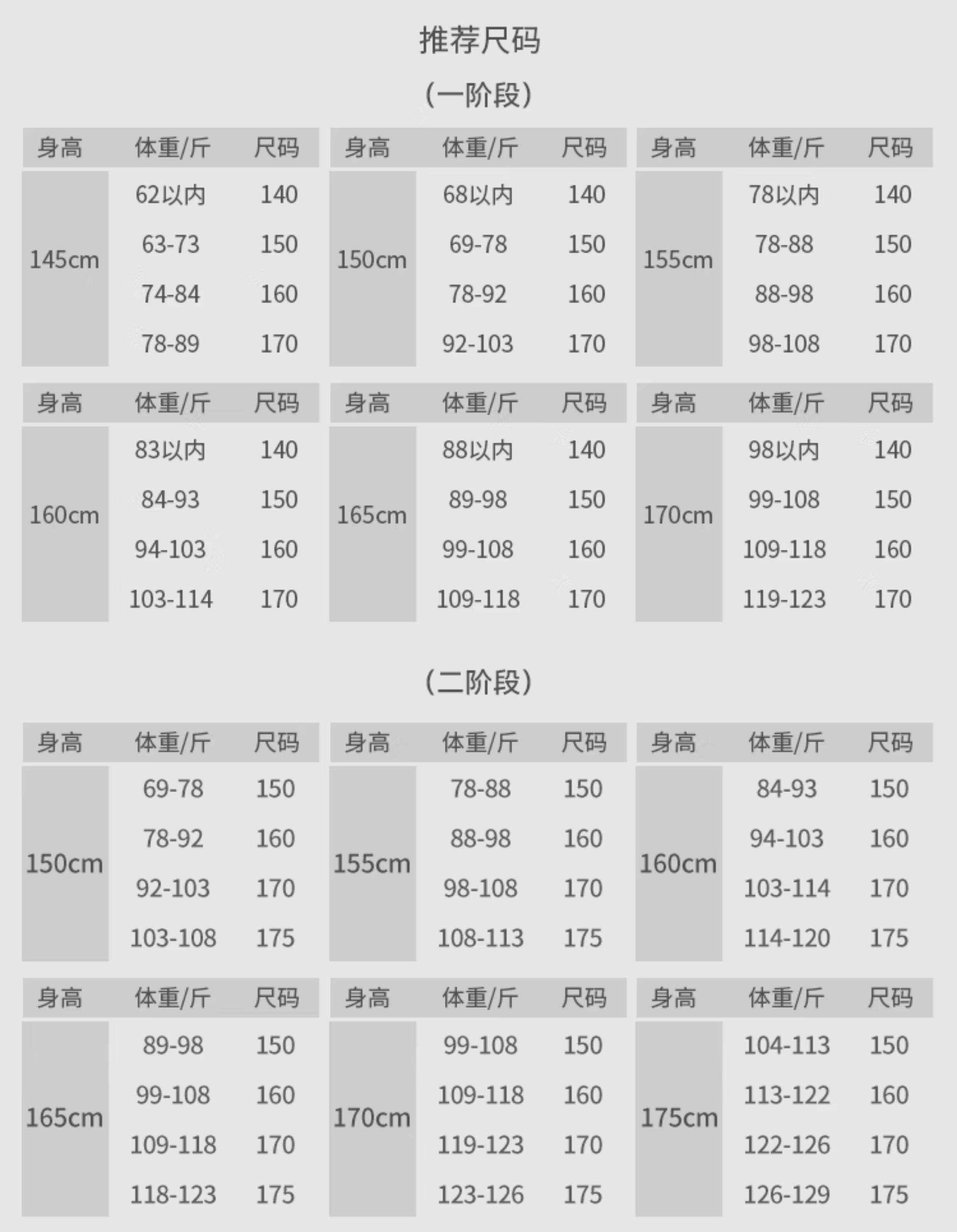 身高 140/70A,150/75A,160/80A,170/85A,175/90A