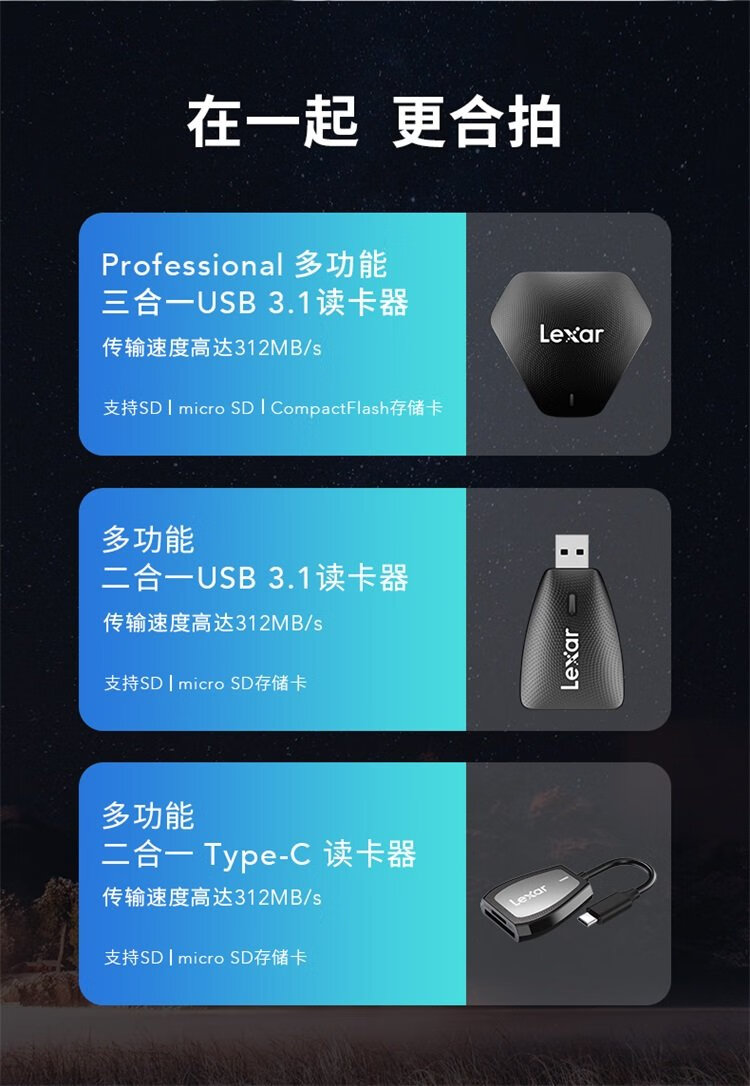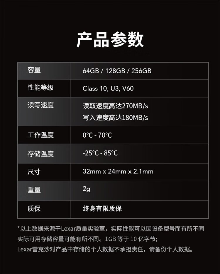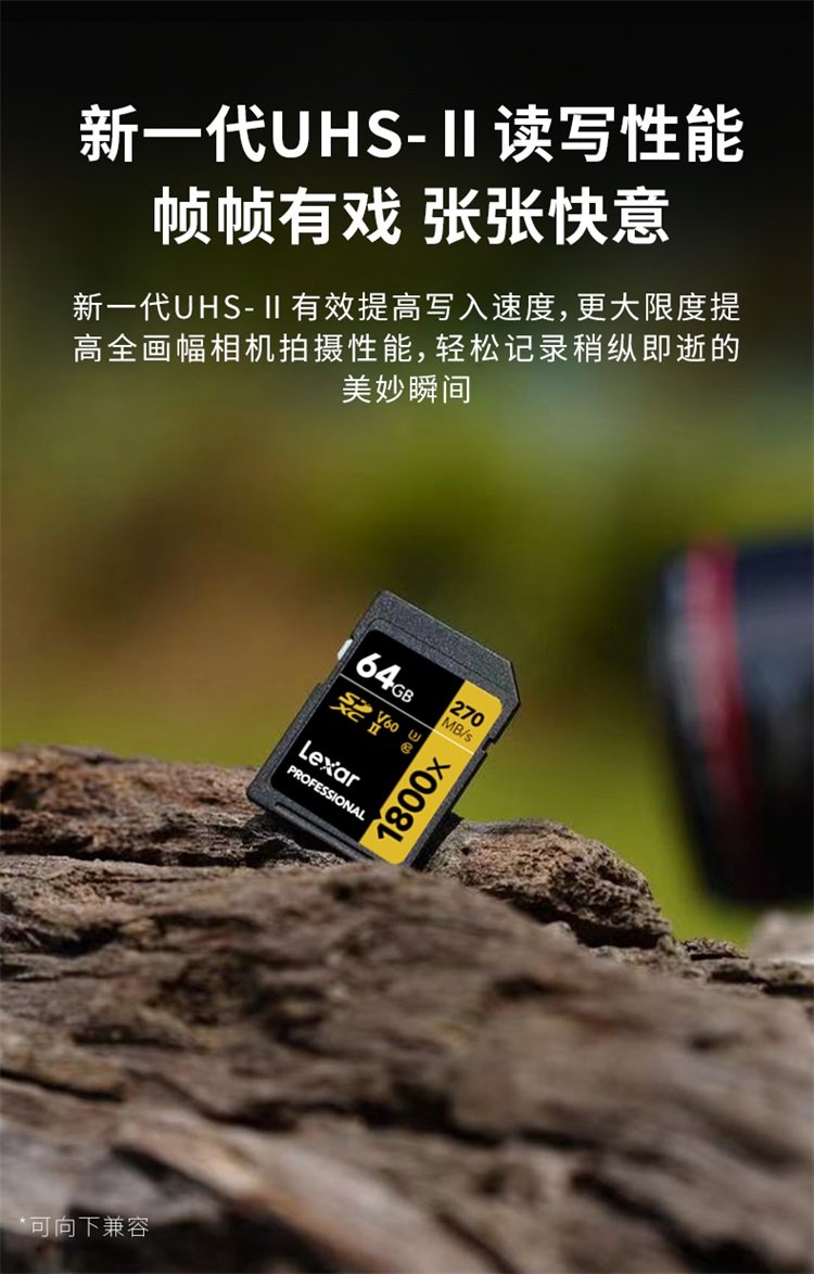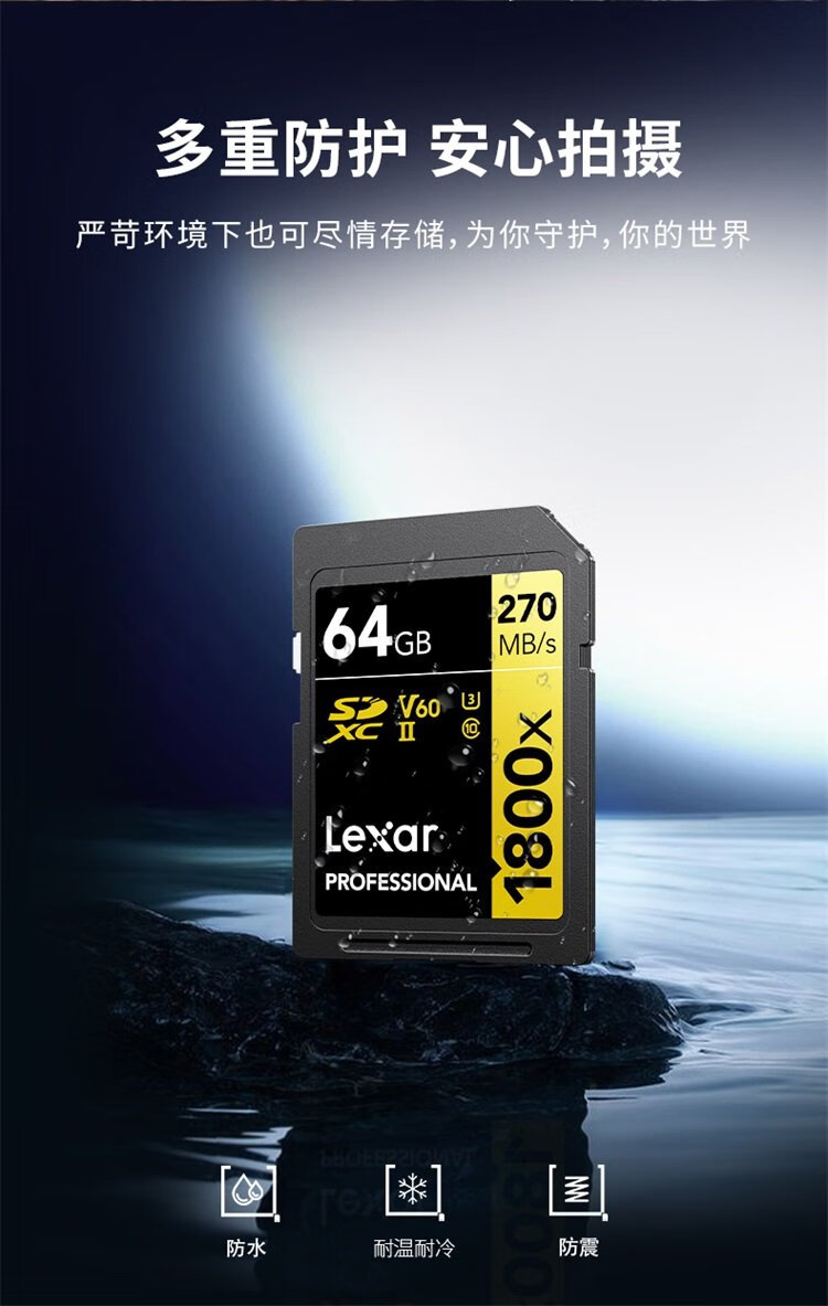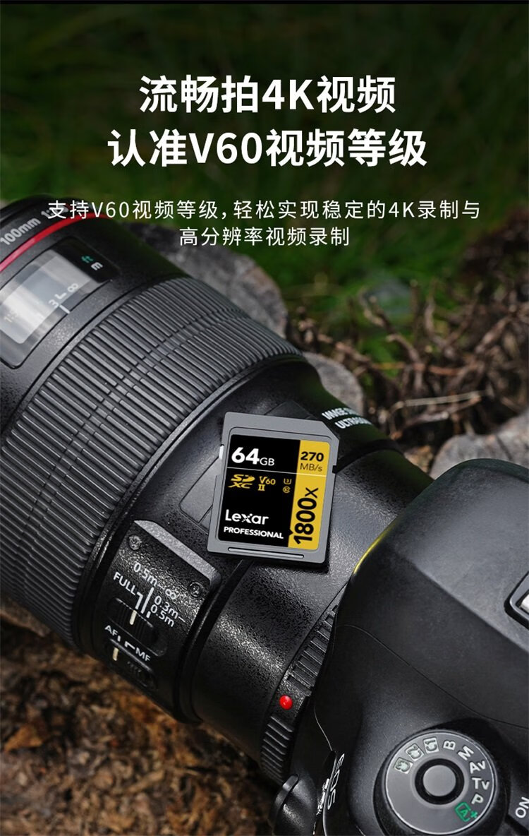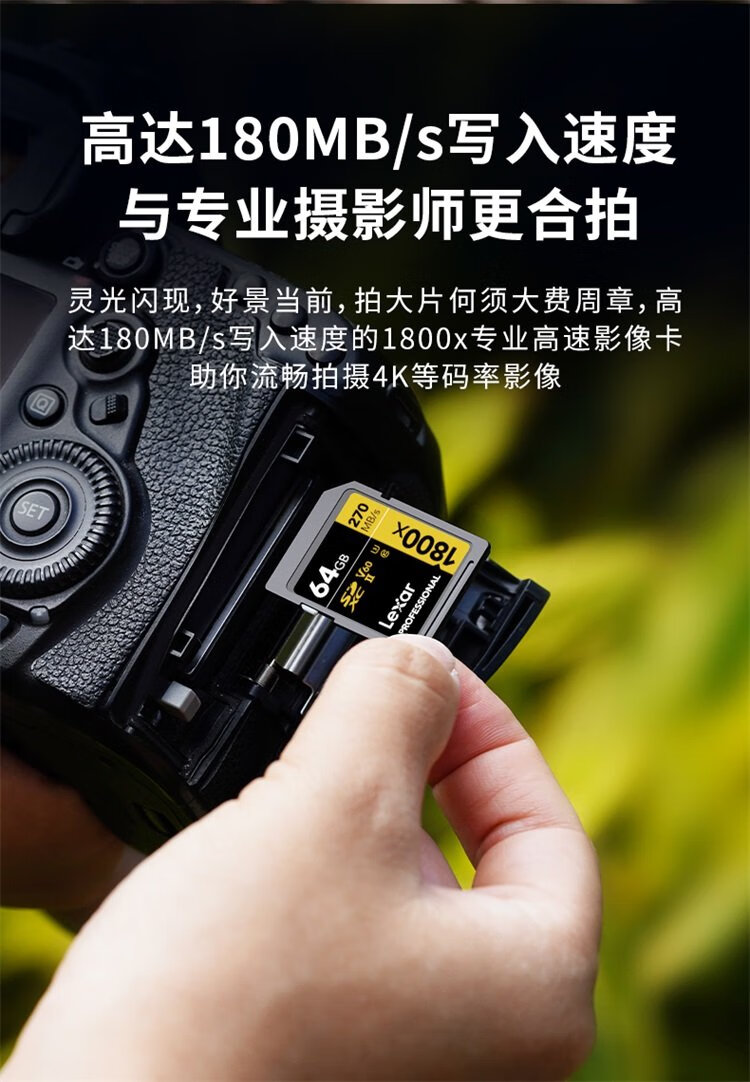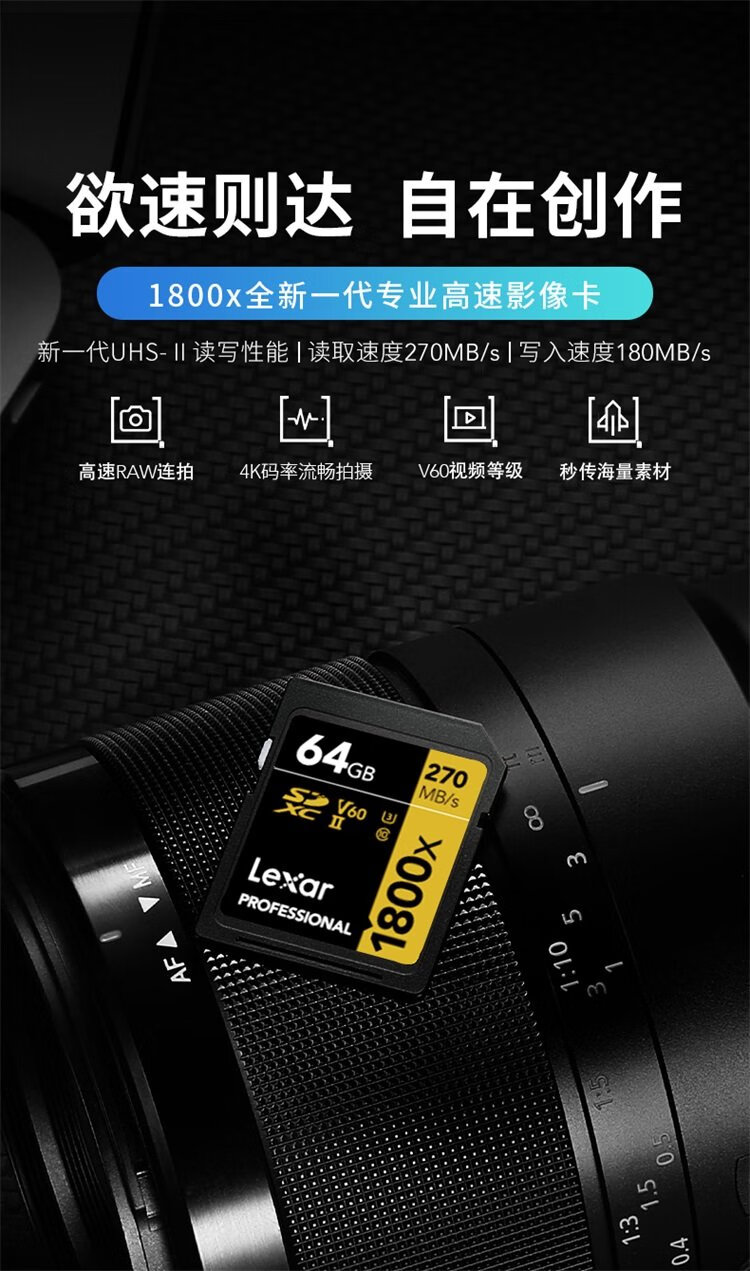 Lexar 64GB SD memory card C10 U3 V60 digital camera high-speed memory card, read 280MB/s, write 210MB/s, 4K shooting (1800x)