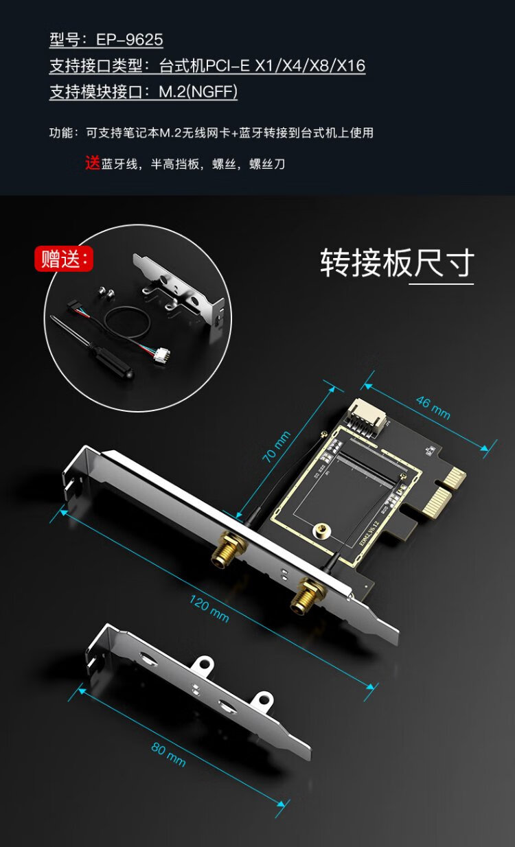 EDUP NGFF M.2 to PCI-E desktop adapter board/card wireless network card Intel 9260 AX200 bare board with AC antenna EP-9625