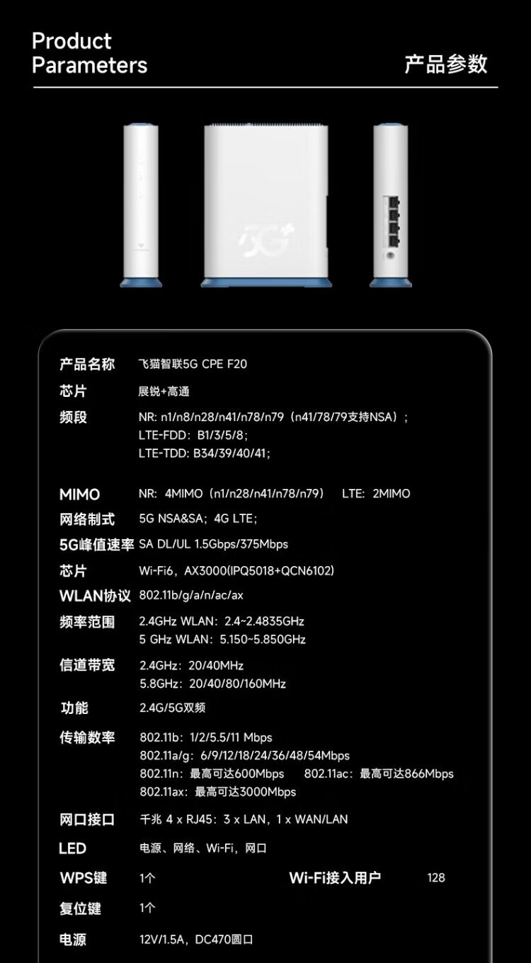 Feimao Zhilian F20 5g enrutador interior cpe wifi portátil inteligente 4g puerto de red gigabit de alta velocidad oficina transmisión en vivo Internet tarjeta del tesoro red de alta velocidad