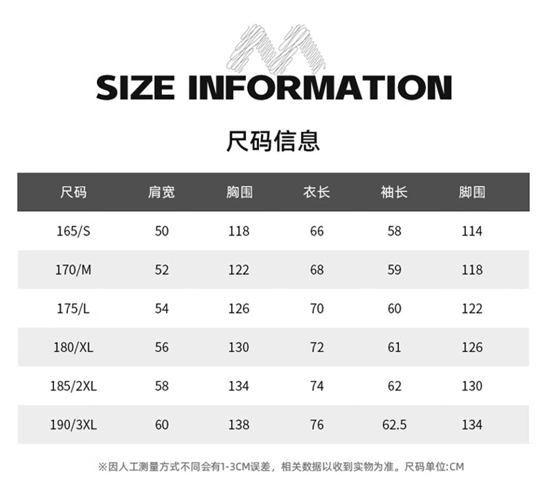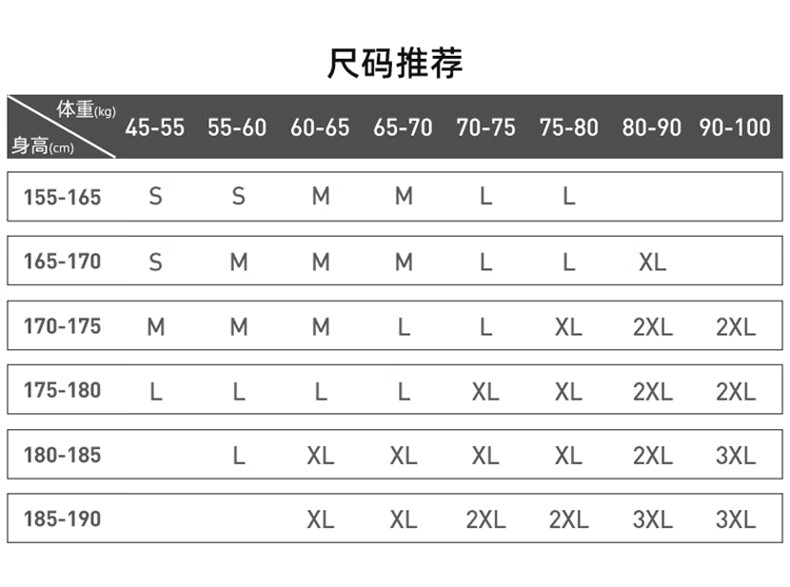 China (cm) 165 / 88-90 170 / 96-98 175 / 108-110 180 / 118-122 185 / 126-130