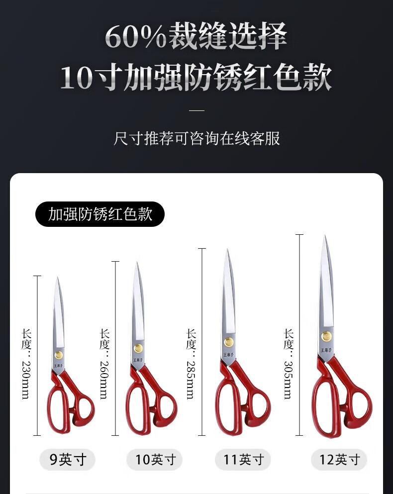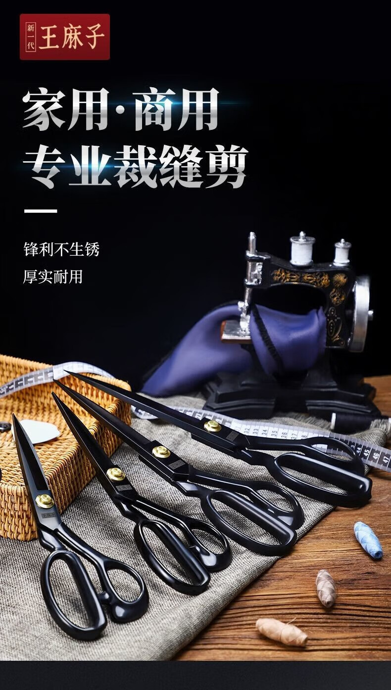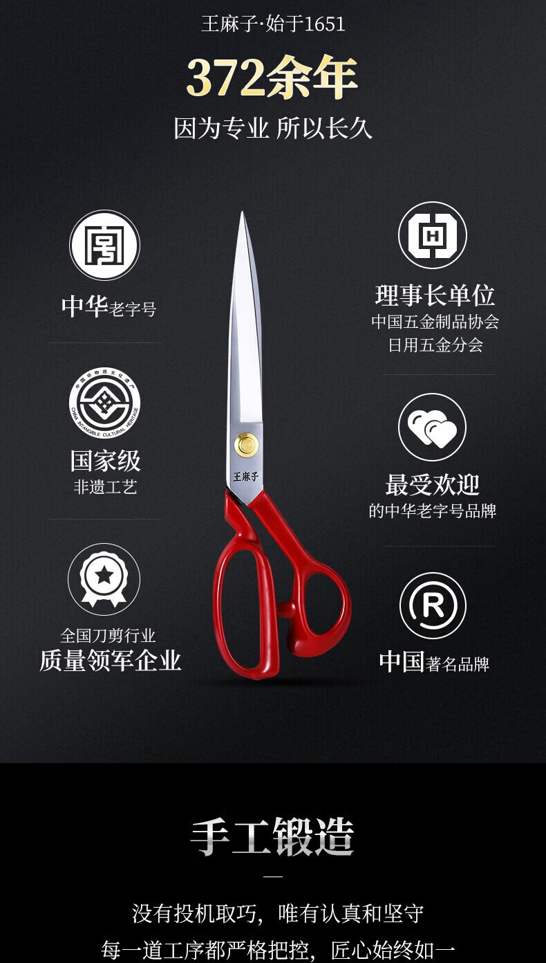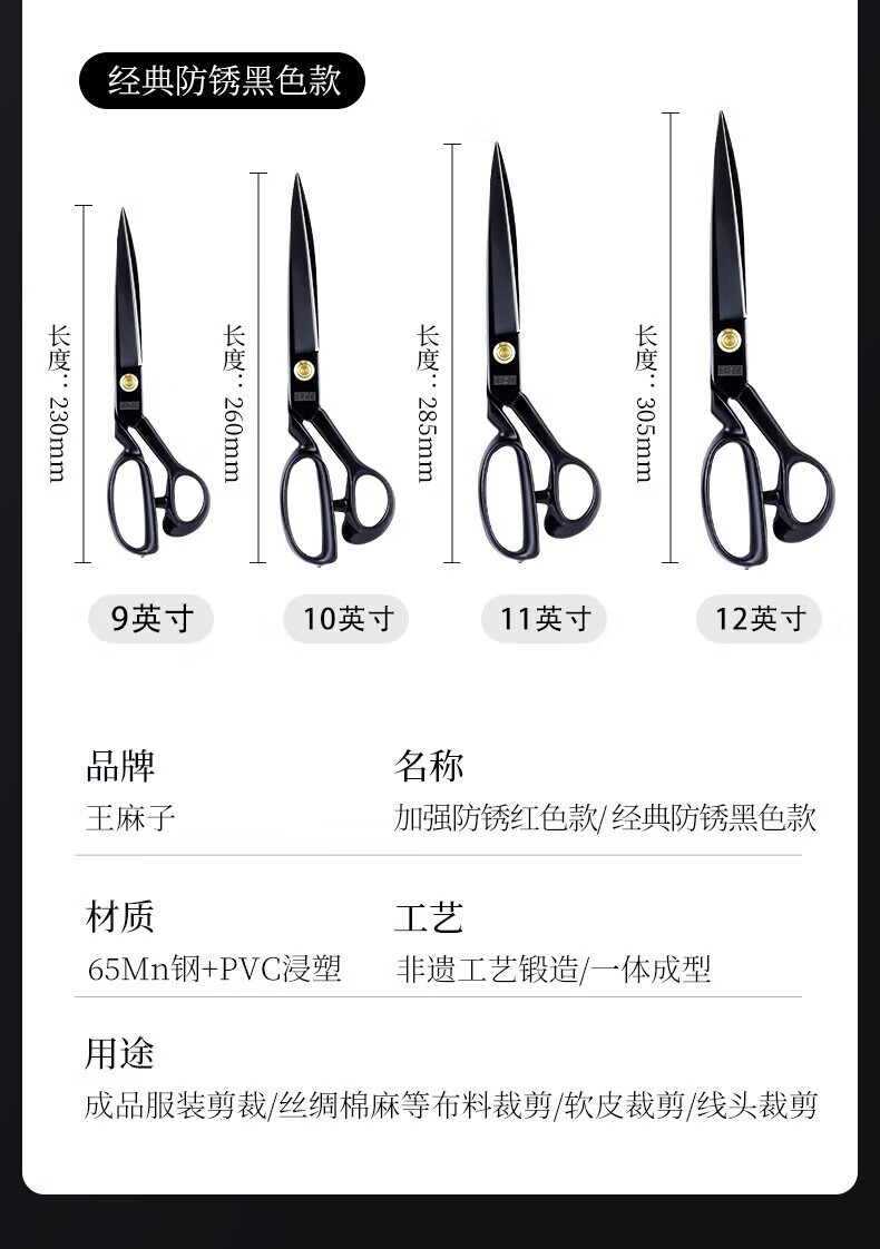 王麻子剪刀家用剪子剪布裁缝剪刀服装手工大剪刀工业用剪线头缝纫剪刀 12英寸防锈专业裁缝剪刀【黑】