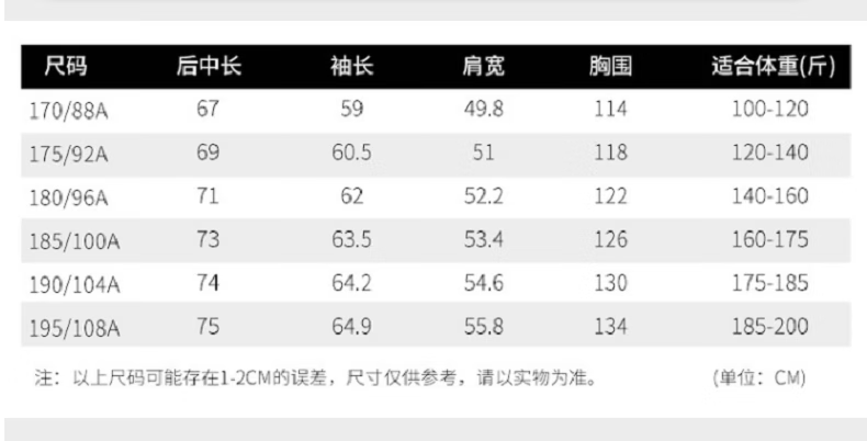 China (cm) 165 / 88-90 170 / 96-98 175 / 108-110 180 / 118-122 185 / 126-130