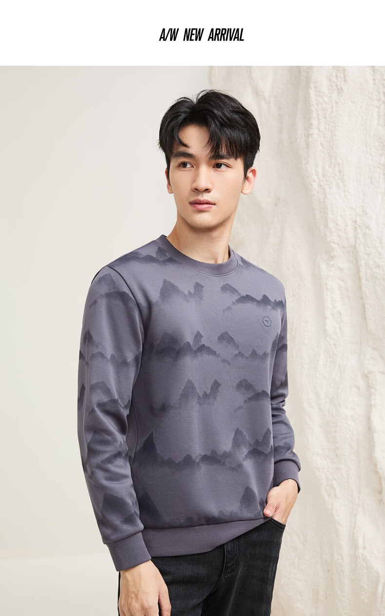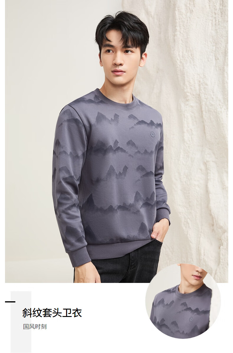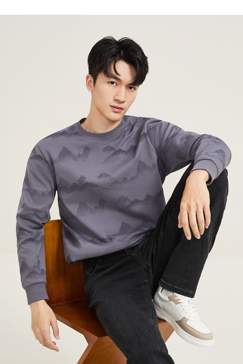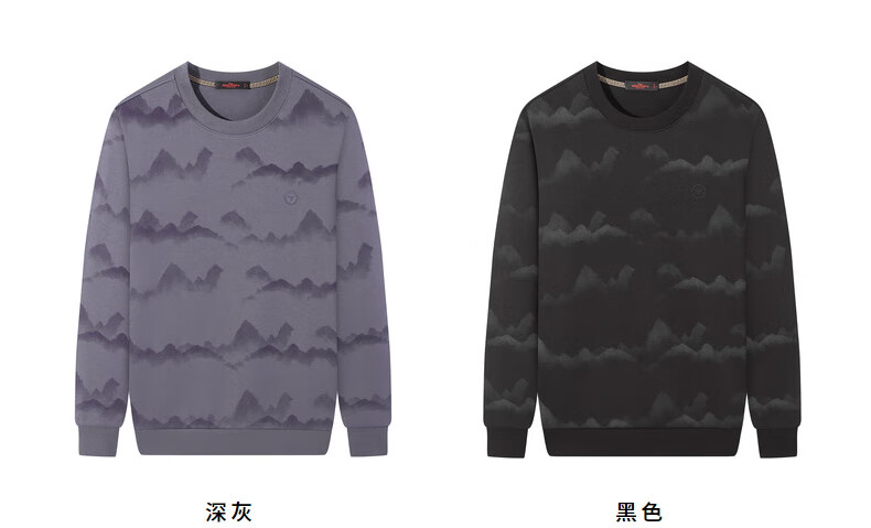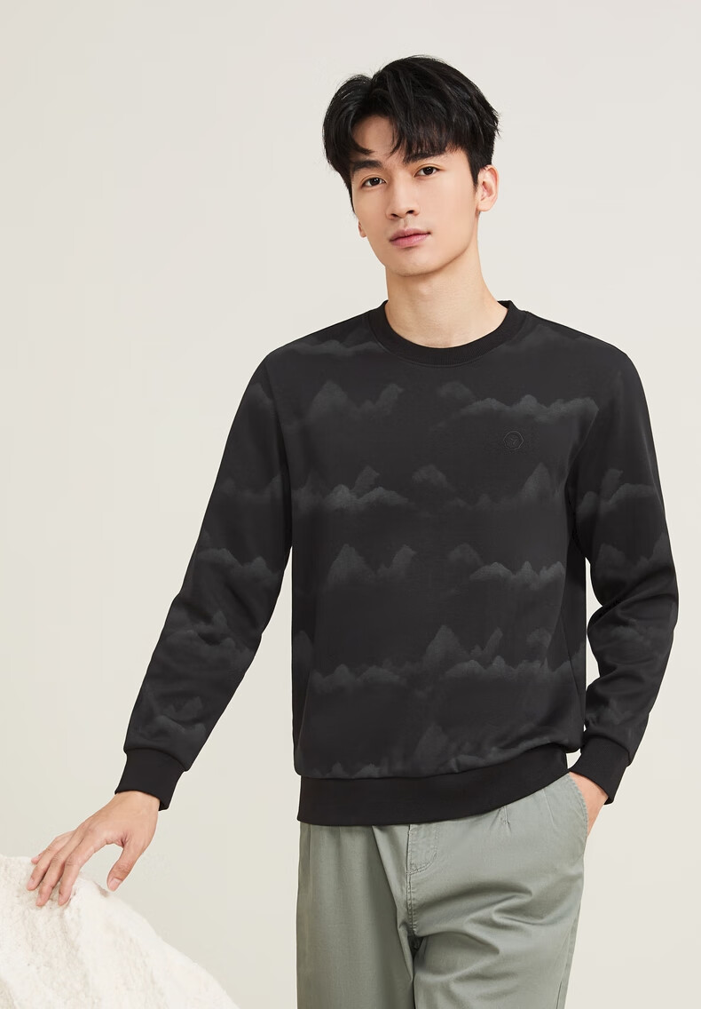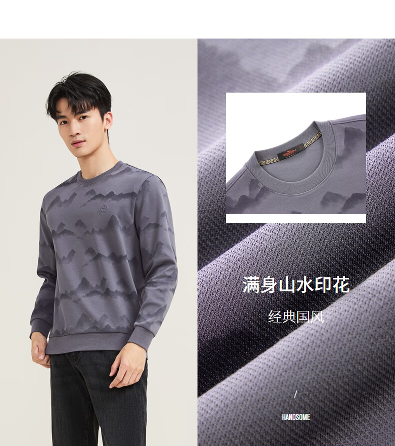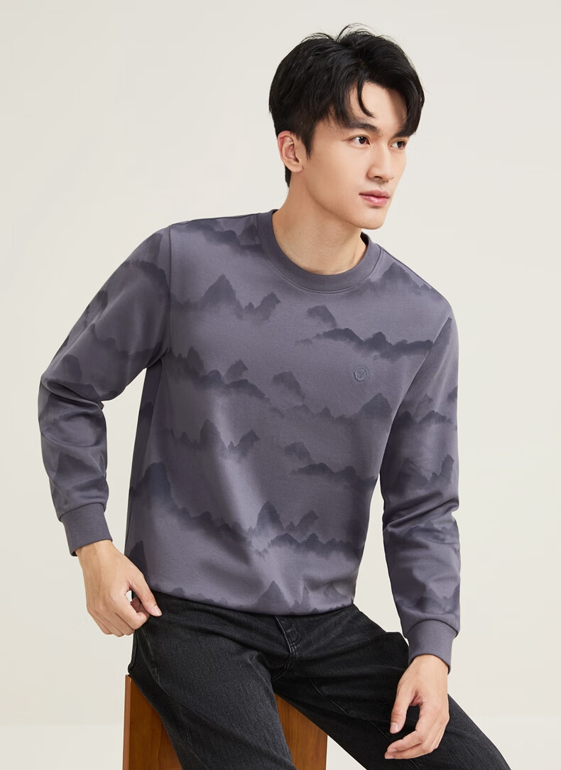 Qipai Xinjiang cotton/national style landscape print round neck sweatshirt for men 2025 autumn and winter new casual versatile top trend dark gray S (165)