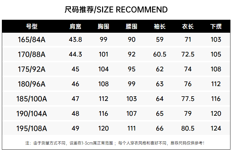 China (cm) 160-165/84-86 165-170 / 88-90 167-172 / 92-96 168-173 / 98-102 170-176 / 106-110
